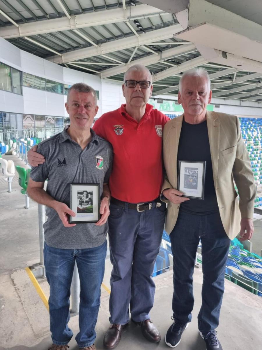 Glentoran Gazette Joint Editors Norman Ternahan (left) and John Grayden (right) receive this year's award from David Hand, Chairman of the NIFPCC.