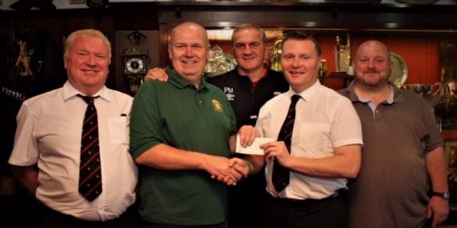 The cheque was handed over by Jimmy Carter (second left), Chairman of the Glentoran Supporters Committee (1923) to Glentoran Chairman, Stephen HendersonAlso photographed (left to right) are John Moore (Glentoran 1882 Director and 1923 member), Paul Millar (Assistant Head Coach) and Adrian McAleese (1923 Committee member). (Photograph by Thomas Sewell)
