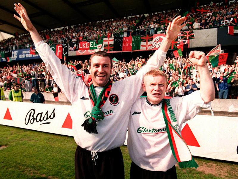 Ian Gilzean and Tim McCann celebrate the Irish Cup Final win over Portadown in 2000