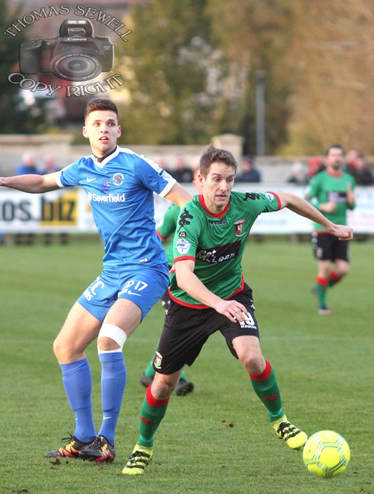 Just before the hour mark Allen won a free kick 25 yards from goal. He took it himself but his shot was well wide of the left hand post. O'Flynn then chested the ball into Calum Birney's path but again the shot was off target. Glentoran made 3 substitutions to try and change the game. Foley came on for Lavery on 57 minutes and then on 66 minutes Nacho Novo replaced O'Flynn with Ciaran Caldwell replaced McAlorum. The latter two changes perhaps seemed harsh with both skipper McAlorum and striker O'Flynn putting in good, workmanlike performances but with the game looking gone thoughts had maybe turned to the Boxing Day derby.