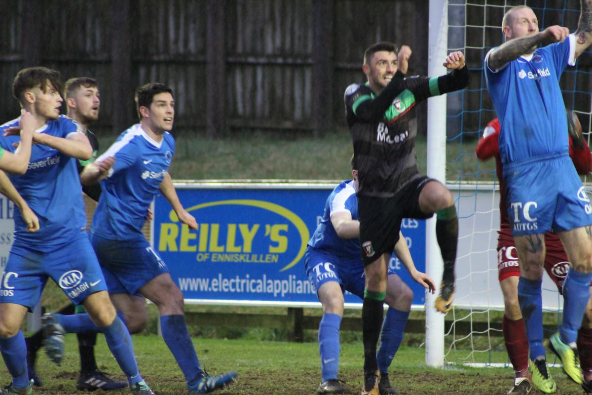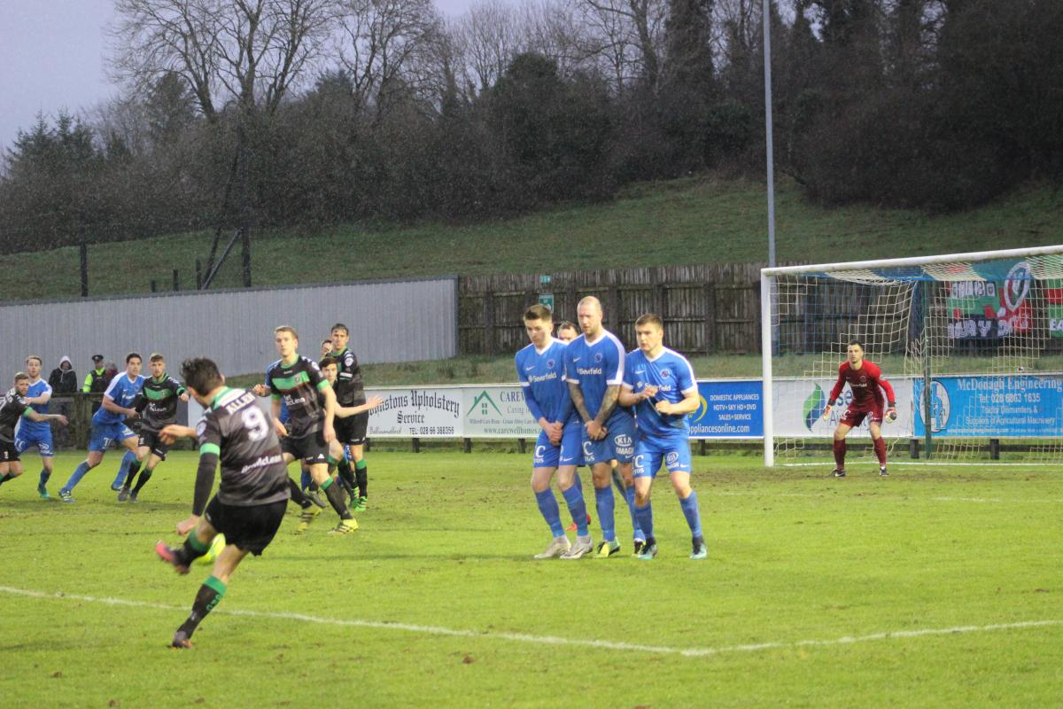 Glentoran drew level on 19 minutes. A foul on Davidson gave Knowles the opportunity to deliver a free kick into the danger area. The Mallards keeper was hesitant and missed the ball completely, allowing the inrushing Allen to fire home his 10th of the season. 5 minutes later another Knowles set piece almost brought another goal however Jonny Addis saw his glancing header go straight into the arms of a relieved Richard Brush. Just after the half hour mark a corner for the home side almost brought another goal. The ball broke to skipper James McKenna but his shot was deflected up and over the crossbar. Ballinamallard United were on top at this stage and had another opportunity to go in front when Willie Garrett fouled Shane McGinty just inside the area. Referee Evan Boyce awarded the penalty and Ryan Curran duly dispatched it past Morris. A superb double save by Elliott Morris prevented the Glens being 3-1 down at the break. Dylan Davidson conceded a needless free kick and Sean Noble's 25 yard effort was tipped onto the crossbar by Glentoran's veteran keeper. Packie Mailey followed up but again Morris was in the right place to make a crucial stop.