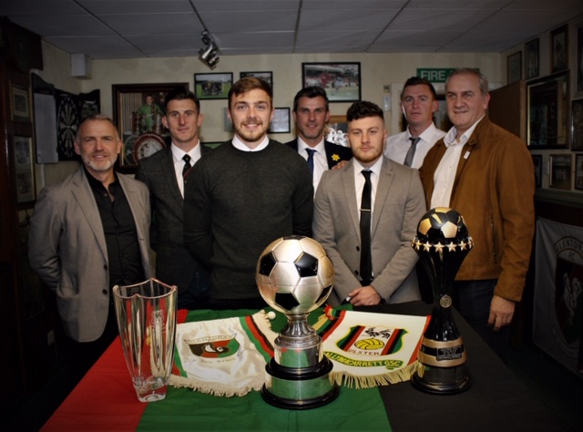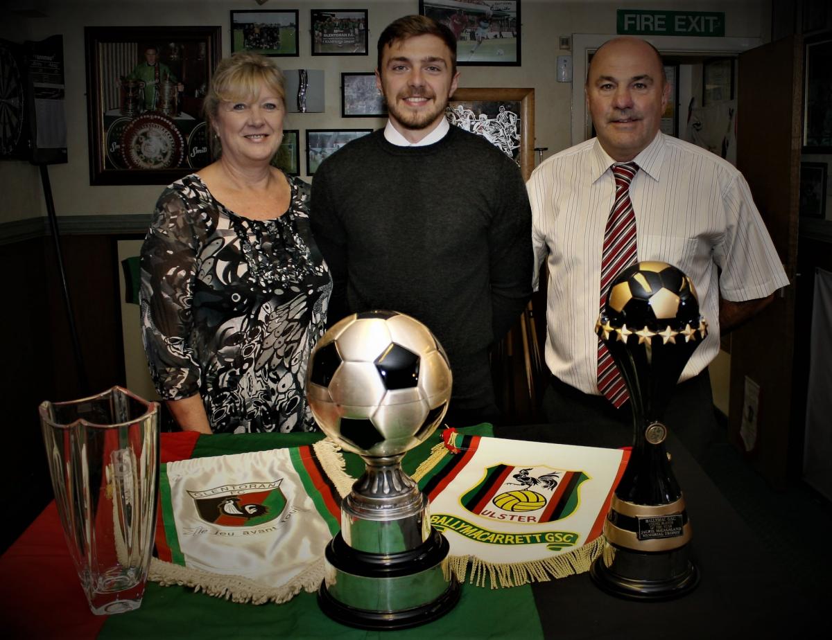 Robbie and Nathan with Ballymac Chairman Thomas Sewell and former winner and current Glens star and goalkeeper coach, Elliott Morris