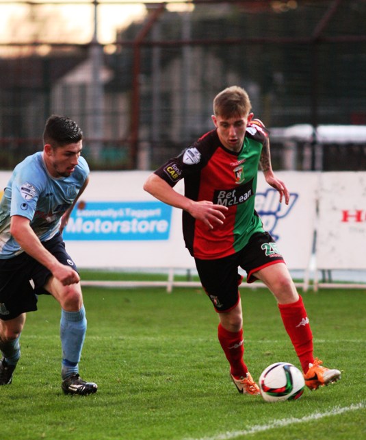 Elliott Morris then had to get down sharply to turn a shot from Allan Jenkins away for a corner. From the resulting set play Gareth Rodger's header was off target. Curtis Allen tried his luck from 35 yards on 20 minutes but although his effort was on target it was easily dealt with by Nelson. The Glens number 9 then tested Nelson again after picking up an excellent ball from Steven McCullough. The Ballymena keeper's clearance fell to Marcus Kane but his snap shot failed to hit the target. A long ball out of defence from Morris was flicked on by Allen on 36 minutes with Jonny Addis just failing to get a touch on it inside the 6-yard box. A minute later Gareth Rodger had a great chance when he broke free but he fired over from the edge of the area.