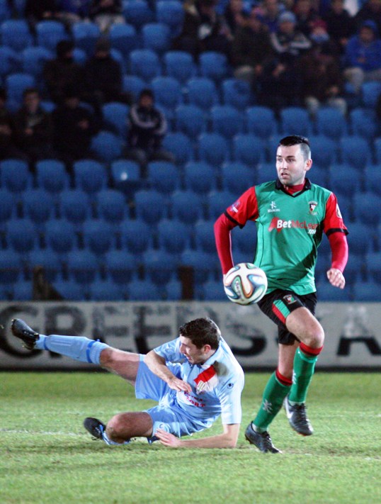 The home side responded with Cushley firing narrowly over from 25 yards out on 18 minutes but the game then got scrappy with neither side able to fashion any scoring opportunities. With 33 minutes on the clock former Glentoran striker, Darren Boyce got past Johnny Addis but his low drive was well saved by Glens' skipper, Elliott Morris. From the resulting corner Stephen McAlorum's sliced clearance almost ended up in his own goal but Henderson cleared the danger. At the other end a free kick to Glentoran was cleared to the edge of the area. McAlorum got on the end of it but his effort was straight at the keeper. 7 minutes from the break the home side missed a great opportunity to cut the lead to a single goal. Ballymena United took a short free kick and Tony Kane's effort was tipped over the bar by Morris. When the corner came in United's skipper, Allan Jenkins was unmarked but his close range header failed to hit the target. On 44 minutes though the goal that Ballymena United had been threatening finally arrived. Barry Holland didn't deal with a long ball forward and when it was played across by Stephen McBride, Tony Kane drilled it into the bottom corner from 16 yards out.