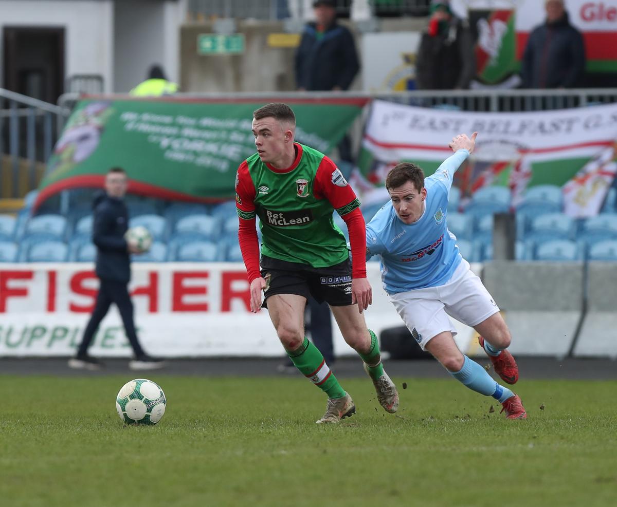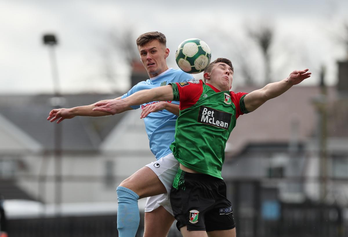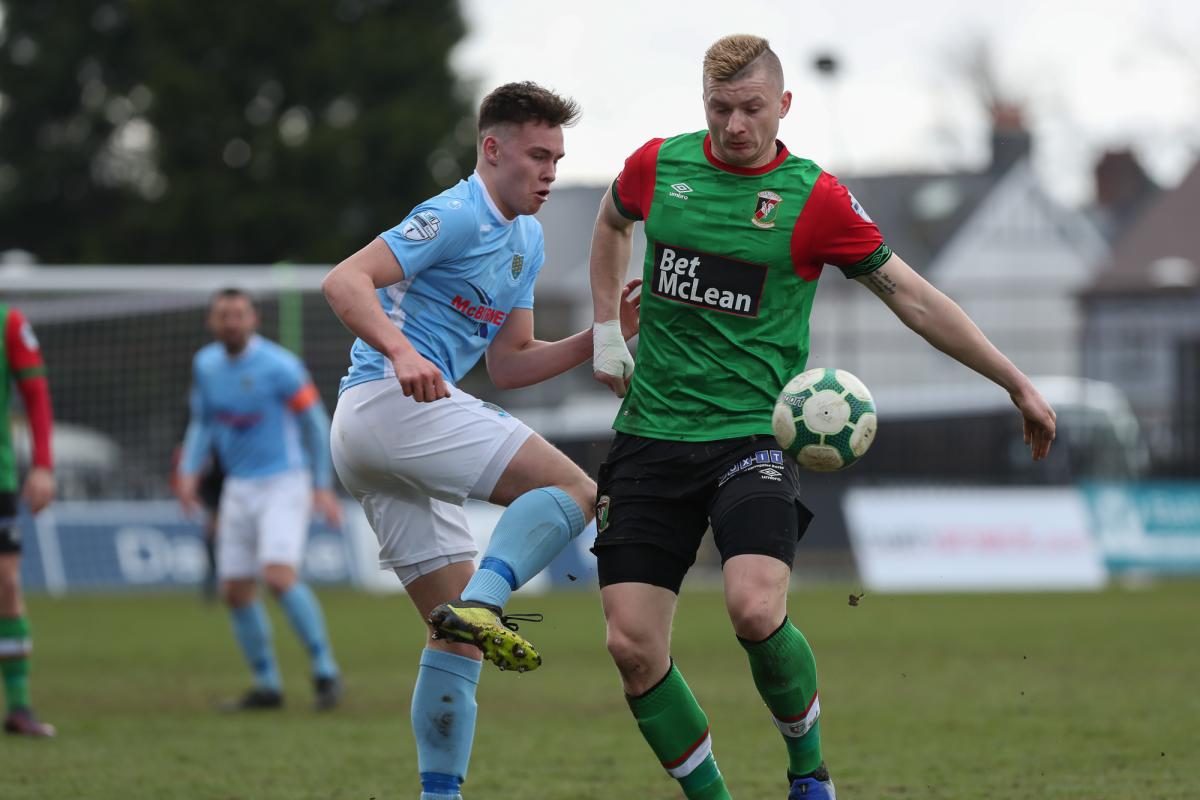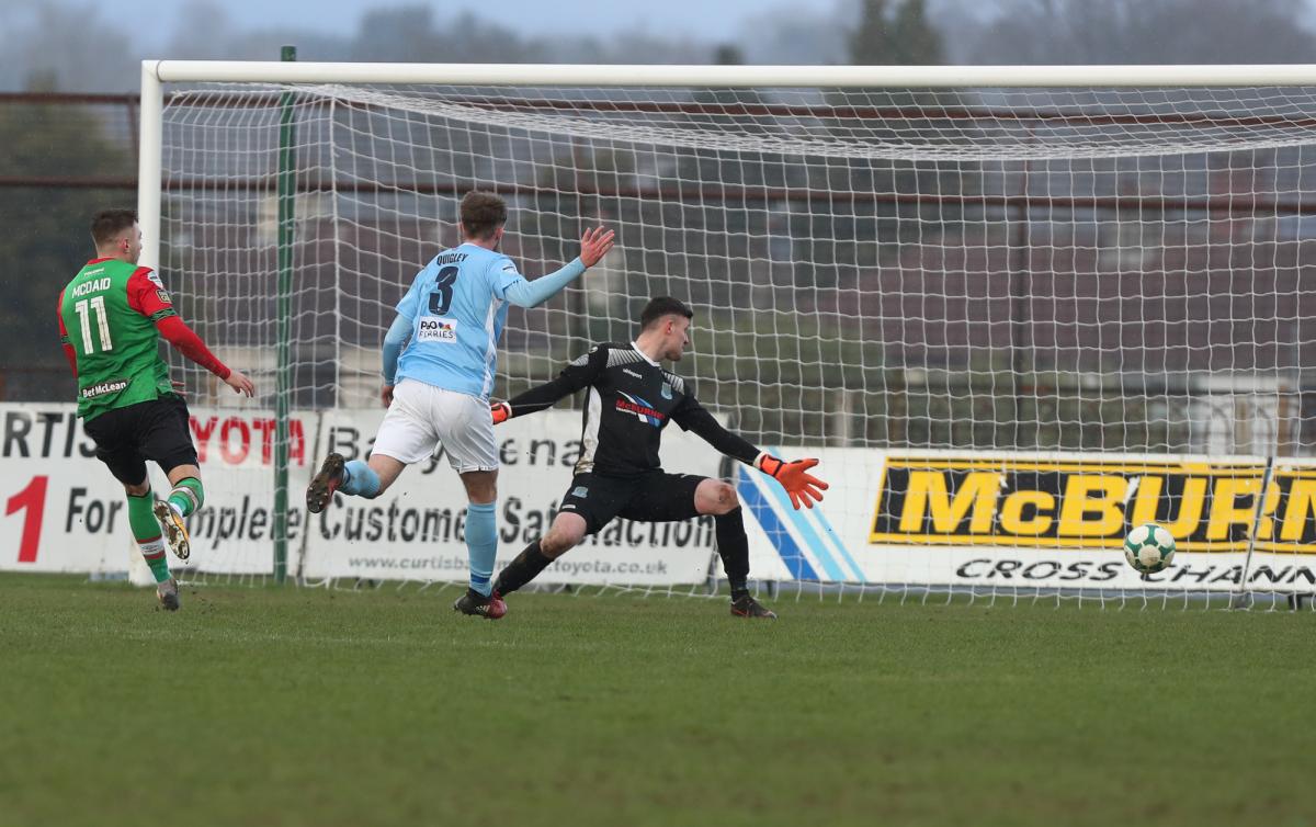The Sky Blues almost levelled things up on 47 minutes but Elliott Morris was quick off his line to deny McGrory. The Glens then broke straight down field and Curtis Allen's cross broke for Robbie McDaid but the Glentoran number 11 shot wide. The home fans thought that they had a equaliser on 50 minutes when a cross/shot from Watson eluded everyone and almost crept in at the far post with Morris stranded. Their cheers were strangled though as the ball passed the post and hit the advertising boards.