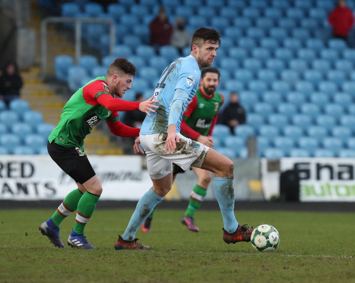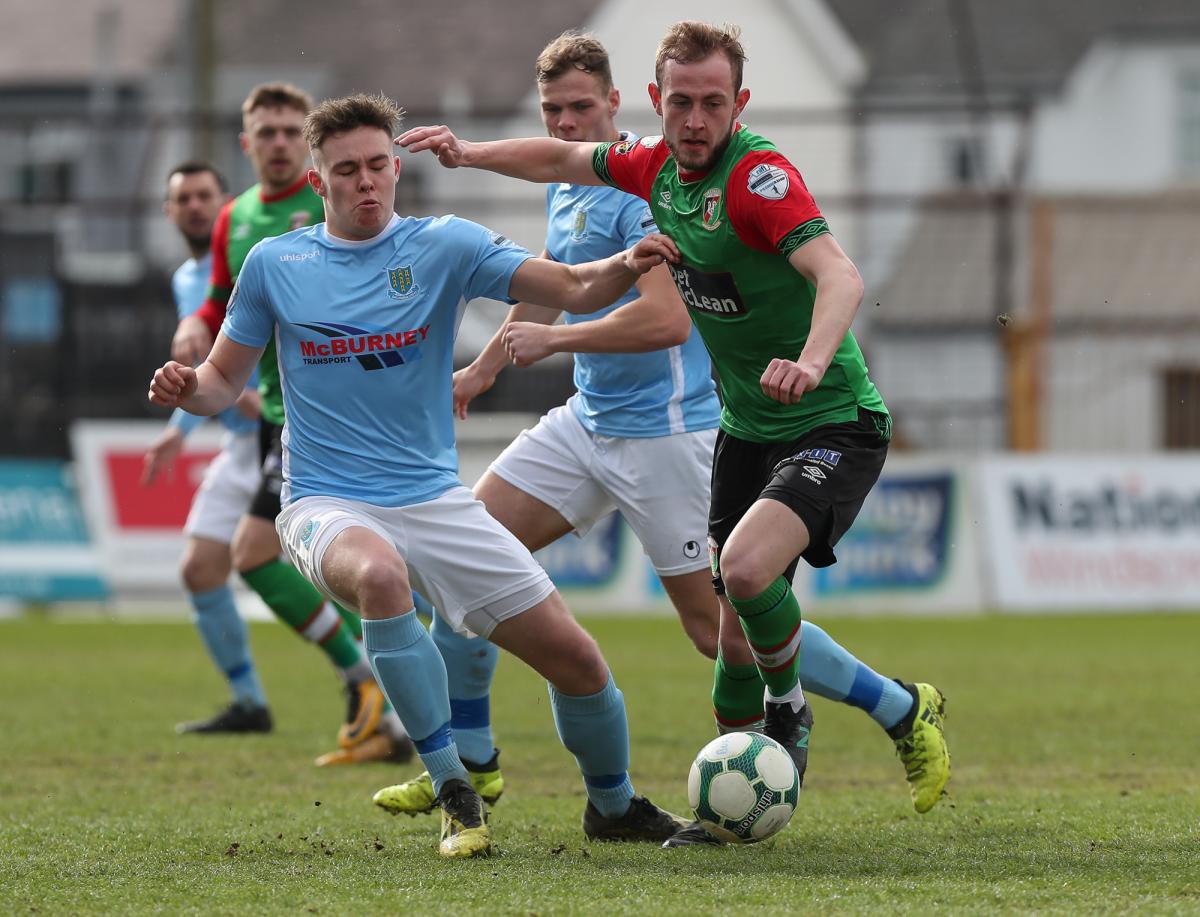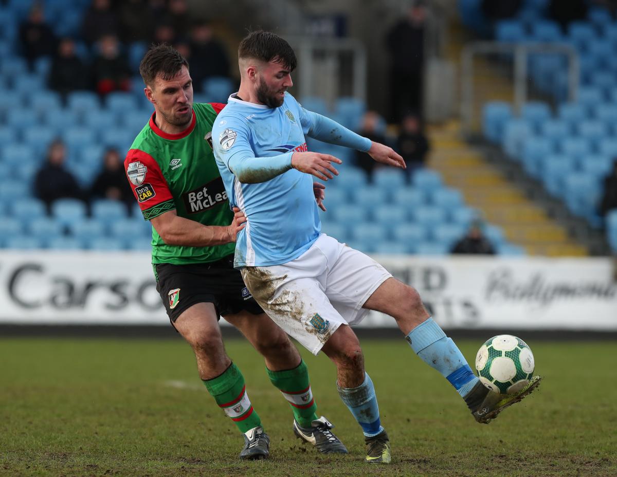 The Sky Blues almost levelled things up on 47 minutes but Elliott Morris was quick off his line to deny McGrory. The Glens then broke straight down field and Curtis Allen's cross broke for Robbie McDaid but the Glentoran number 11 shot wide. The home fans thought that they had a equaliser on 50 minutes when a cross/shot from Watson eluded everyone and almost crept in at the far post with Morris stranded. Their cheers were strangled though as the ball passed the post and hit the advertising boards.