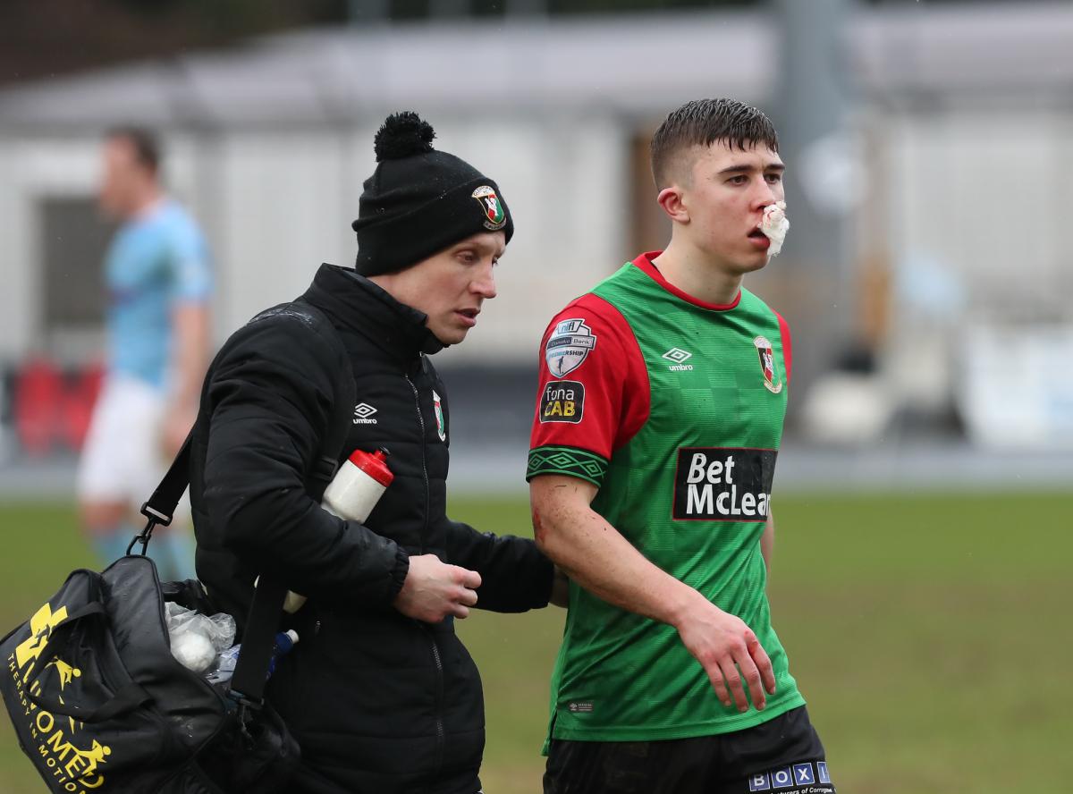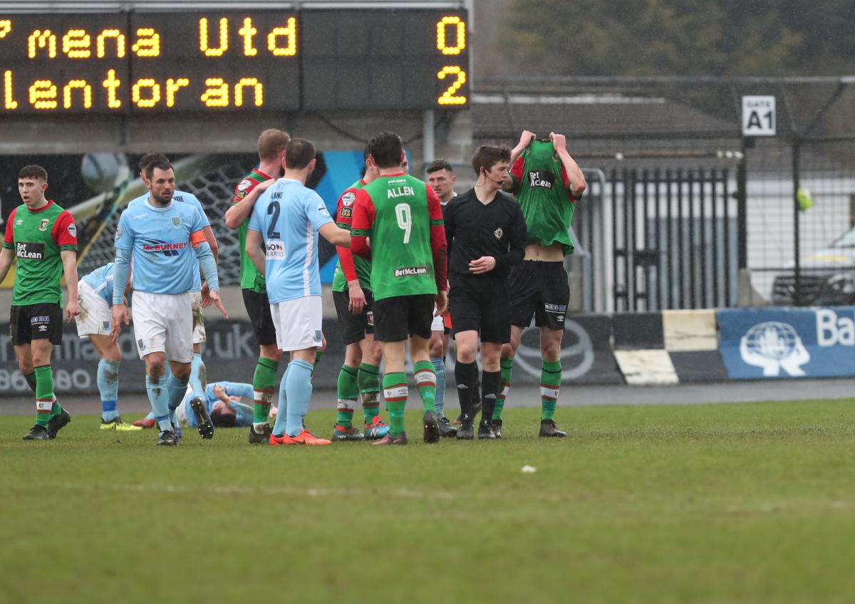 On 72 minutes though their chances of getting back into the contest when James McCarthy was shown a red card following a rash challenge on McGrory. It was a disappointing end for the young defender after he had produced an almost faultless display but having played a one-two with McDaid, McCarthy tried to reach the ball which was short of him and his lunge gave the referee a decision to make and it meant an early bath for the left back. Two minutes later Ballymena United were perhaps fortunate not to also be reduced to 10 men when a reckless high challenge saw Paul O'Neill kicked in the face. Referee Andrews deemed this only worthy of a yellow though despite O'Neill being unable to continue and having to be replaced by Steven Gordon.