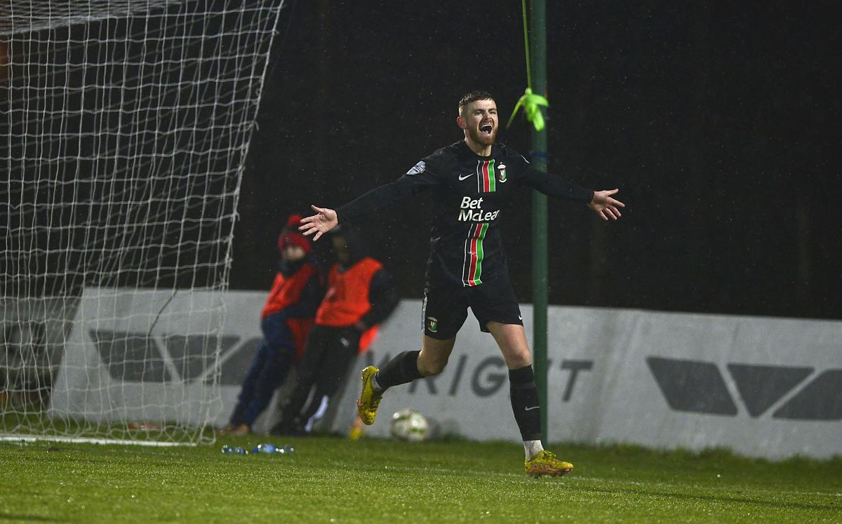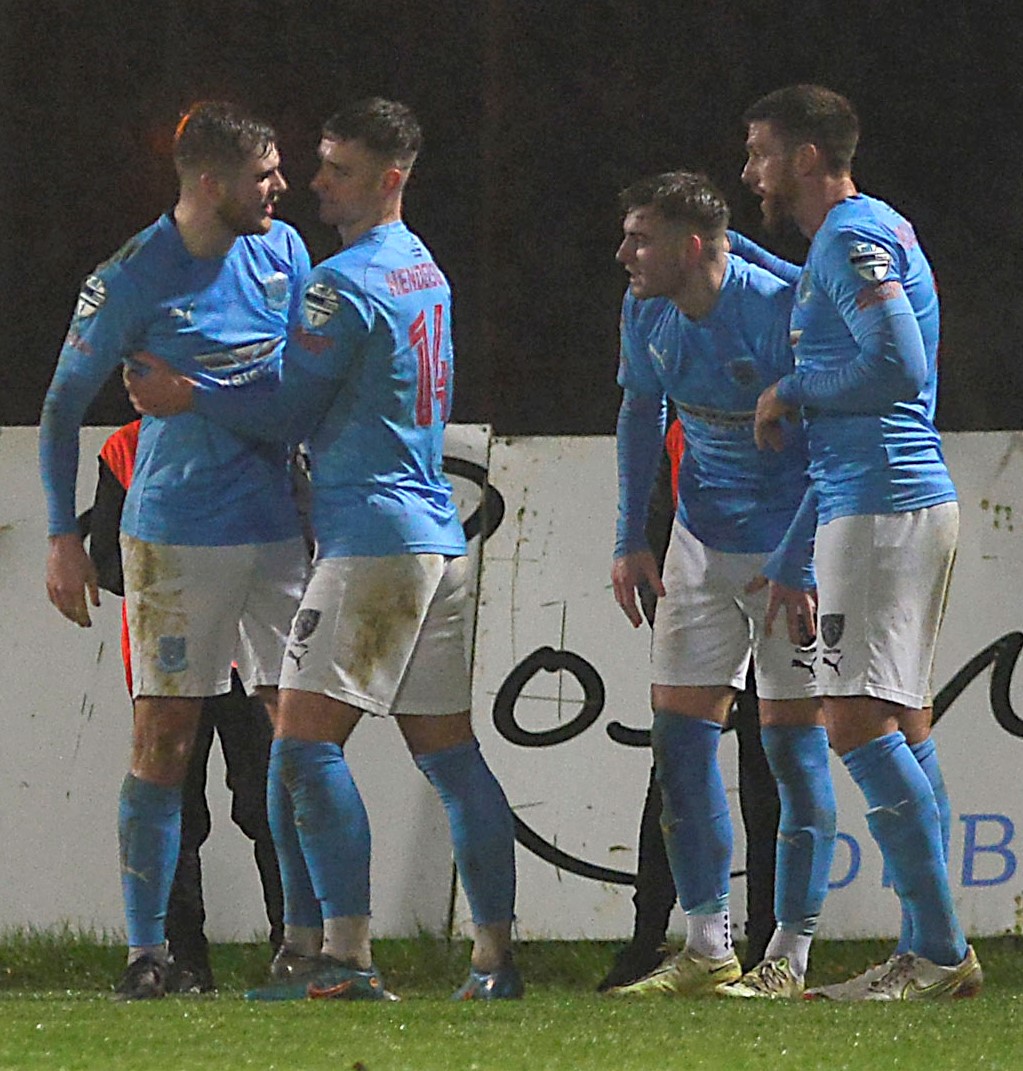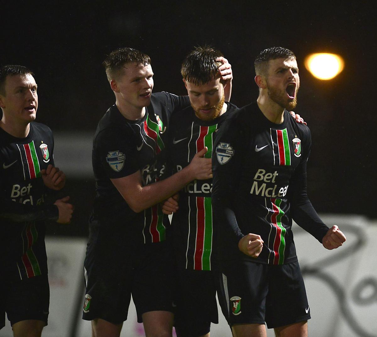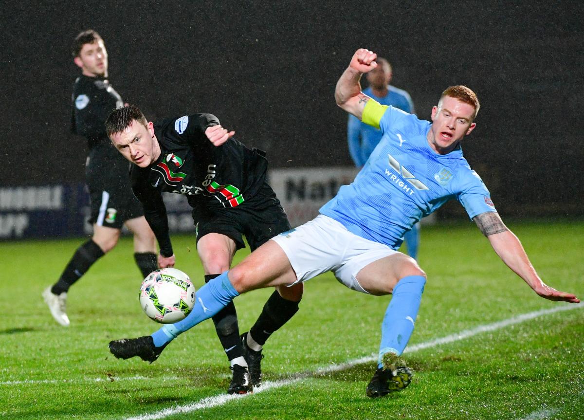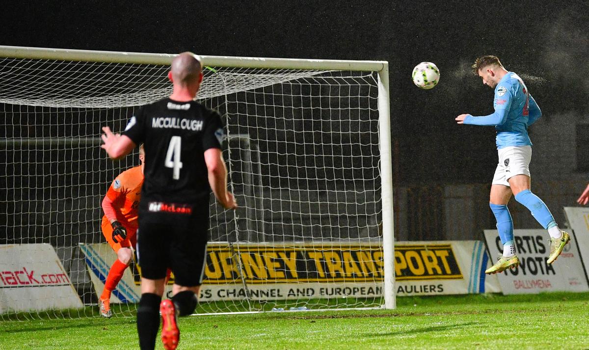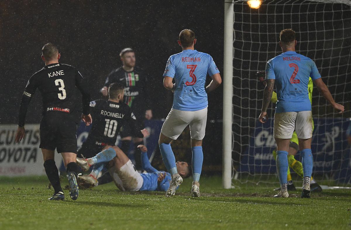 Marcus Kane conceded a free kick near the corner flag early in the second half. Ross Redman swung the ball into the box but Luke McCullough, who had an excellent game in very difficult conditions, headed clear. A foul on Shay McCartan right on the edge of the area was fired toward goal by Glentoran's number 7. Jordan Williamson in the home goal punched it away but the ball eventually reached Conor McMenamin on the right wing. He cut inside Graham before firing a deep cross just beyond the back post. It looked like the ball might go out of play but Aidan Wilson knocked it back into the 6-yard box and Rory Donnelly made no mistake, firing past Williamson to put the Glens in front.