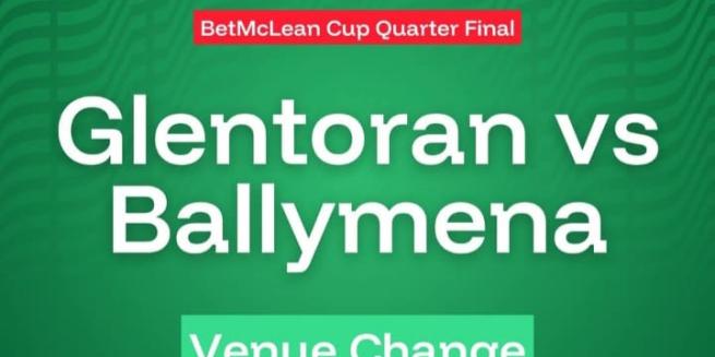 Tonight's BetMcLean Cup quarter-final between Glentoran and Ballymena Utd has been relocated to the BetMcLean Oval following a pitch inspection at the Ballymena Showgrounds.
