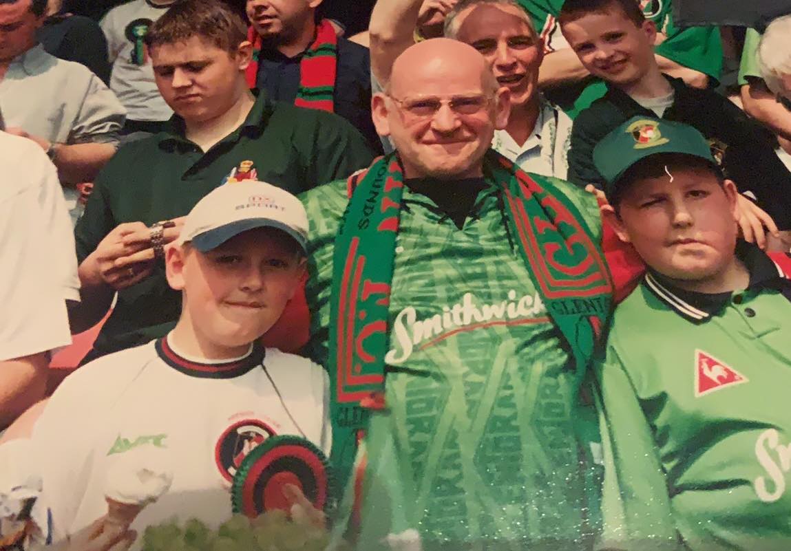 Eddie at the Irish Cup Final in 2001 with grandsons Curtis and Ross. Ross sadly passed away some years ago.
