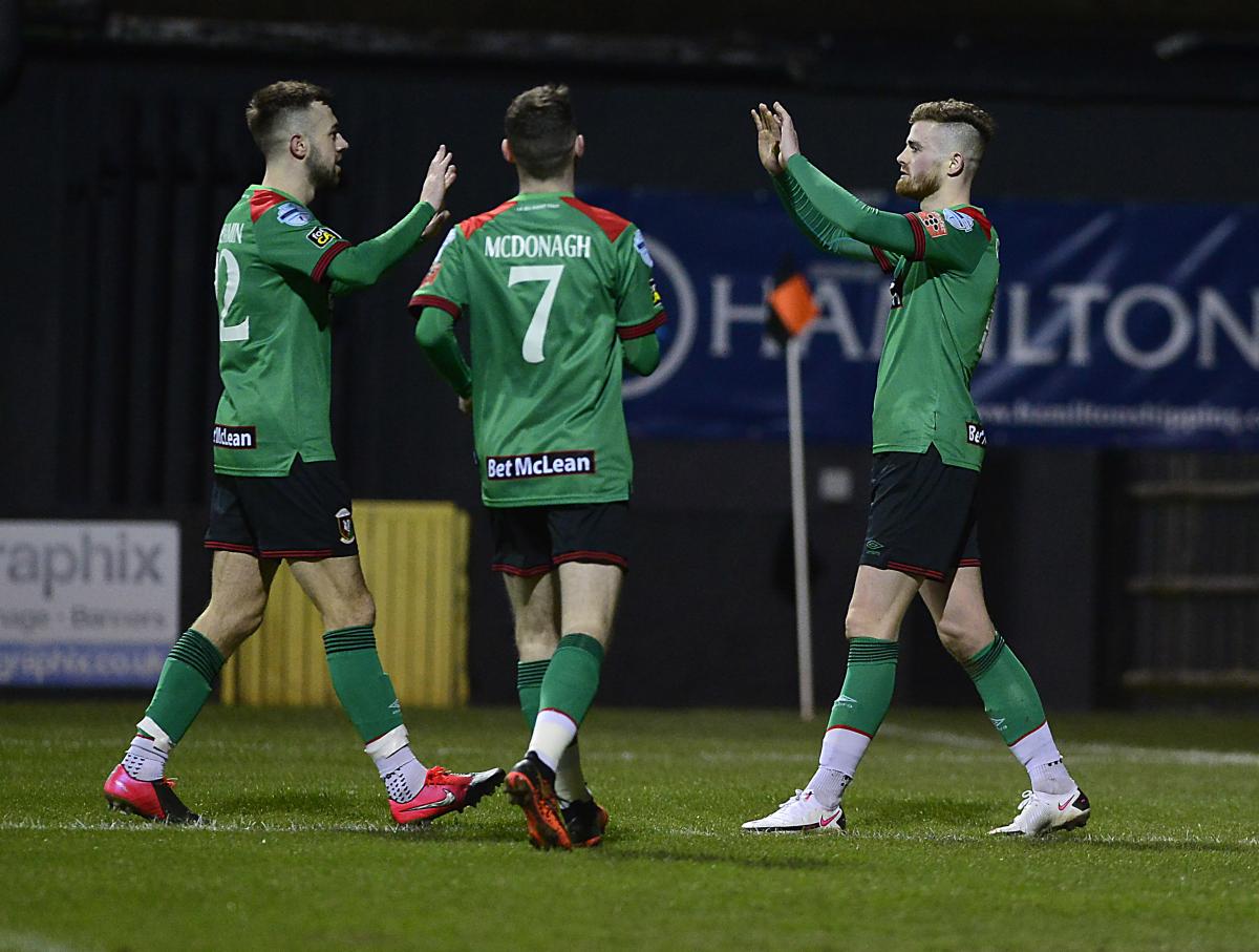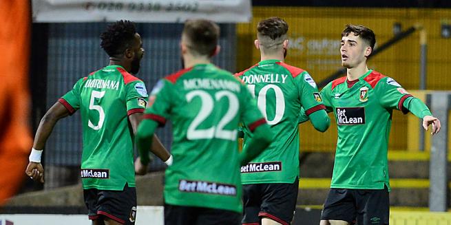 Not surprisingly things quietened slightly after such a hectic spell, until after 29 minutes Rory Donnelly was first to a Crossfield Luke McCullough free kick which he brilliantly headed into the path of Conor McMenamin who had found space to head home for his fourth goal in seven games since his deadline day move from Cliftonville.