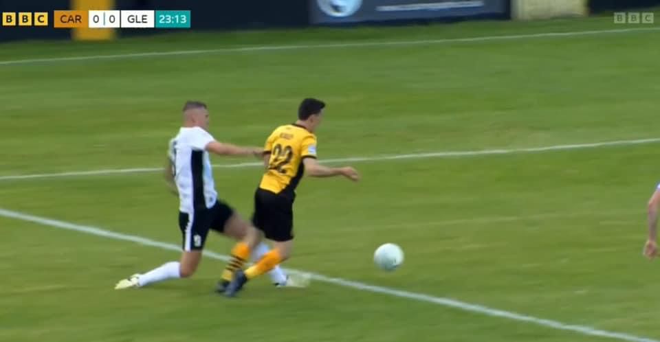 On 22 minutes Carrick took the lead in controversial circumstances when they were awarded a penalty for a challenge by Marcus Kane on the very tricky Paul Heatley. It was a foul but photographs demonstrated it occurred just outside the Glens penalty box. So with a second controversial penalty decision in two games given against the Glens Danny Gibson stepped forward to convert