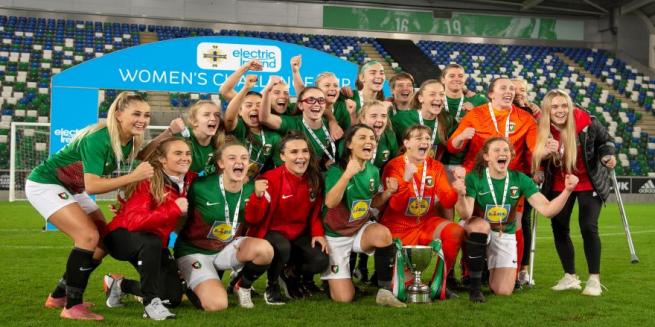 Goals in either half from Northern Ireland internationals Joely Andrews and Lauren Wade saw Glentoran Women secure a clean sweep of trophies for this season and a third consecutive Electric Ireland Women's Challenge Cup tonight at Windsor Park. That means this remarkable group of players have now won the last six trophies senior played for in Northern Ireland!