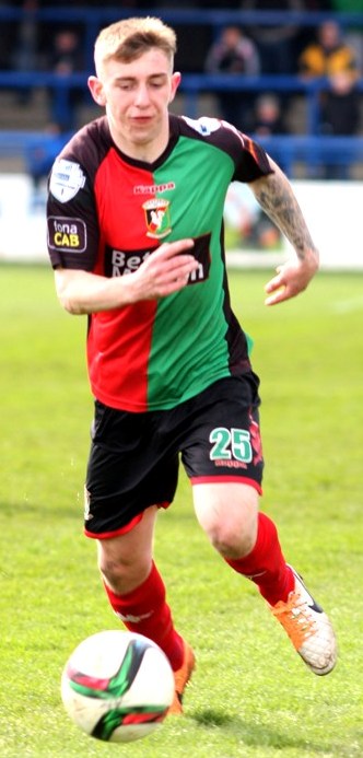 Midway through the first half a free kick on the left was swung into the Glentoran penalty area by Higgins. It went right across goal before being hacked behind for a corner much to the relief of the Glentoran fans behind the goal. On the half hour mark Glentoran finally put together an excellent passing move with Morrow eventually finding Scullion on the right but he scuffed his cross and the chance was gone. On 34 minutes Scullion played in Jonathan Smyth. The young striker looked set to level things up but the ball took a bobble as he was about to shoot and he failed to test the keeper. A minute later Curtis Allen tried to curl the ball into the top corner but again failed to hit the target. The final opportunity of the half fell to the goal scorer, McLaughlin but although he beat Jay Magee in the air, he headed wide of the goal.