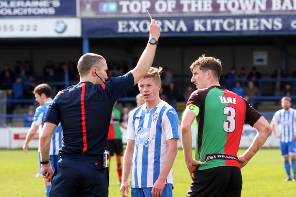 On 67 minutes, with the Glens really piling on the pressure, Allen had another free kick blocked. The ball broke to Steven Gordon but his shot was also blocked and skipper, Marcus Kane then saw his effort cleared too! Coleraine were hanging on but only just. 2 minutes later and Fra McCaffrey's cross from the left was dumied by Smyth, allowing Allen a clear shot on goal. Glentoran's top marksman connected well but his strike crashed off the bar. With 15 minutes remainng Coleraine finally had another attempt on goal; James McLaughlin's 25 yard drive flying just over the Glentoran crossbar. Back up the other end we went and the ball was played into the Coleraine area. As Curtis Allen closed in Steven Douglas handled the ball and the assistant referee signalled for a penalty. Douglas, who had been booked earlier for a very poor challenge on Steven Gordon, was shown a second yellow card and the home side were down to ten men.