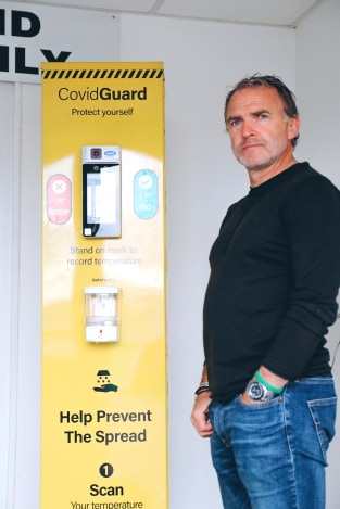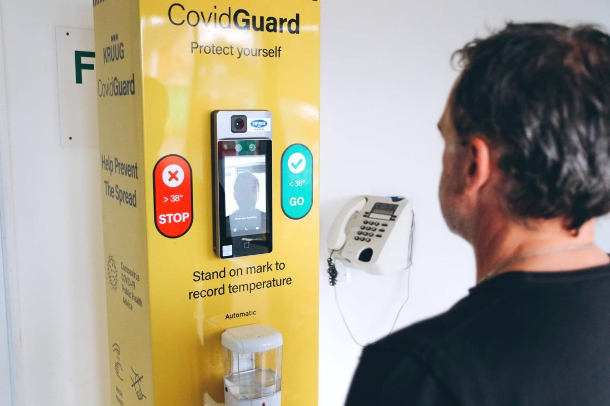 This machine automatically gauges the temperature of anyone seeking entry to the changing room and tunnel area, and either approves or refuses admission based on the temperature of the individual.  It also has a built-in dispenser of handwash.