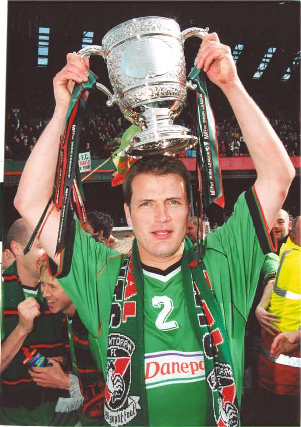 Another Final awaited for a 21 year old Colin Nixon, he was named captain on the day with Chris Walker missing out on a space in the squad. Hugh Dickson started at centre back at just 18 years of age but kept Vinny Arkins, the top goalscorer in the country quiet throughout. The moment fell on a perfectly presented plate from Tim McCann to Ian Gilzean to head home at full stretch the winner as Glentoran won the Cup again. Nixon lifted it high into the sky infront of the North Stand, becoming the youngest ever player to 3 Irish Cup successes. Nixon lifting the trophy became the Gazette photo for the 2000/01 season.