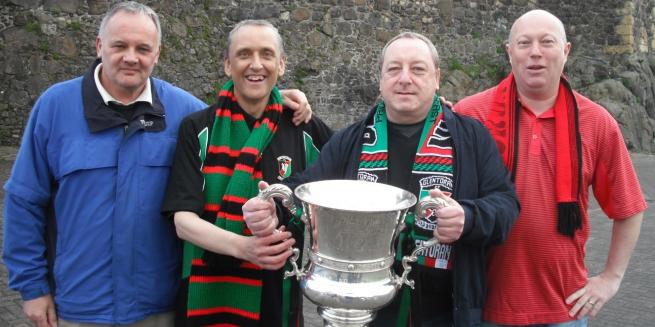 On Saturday 4th May the four friends caught the train from Carrick to Belfast and Davy got to see his beloved Glentoran lift the Irish Cup. He was elated; so much so that he wanted to stay and soak up every minute of the Windsor Park atmosphere. "Just one more minute guys!" Well that one more minute meant they missed their train and had to hang around for half an hour for the next one. Whilst football rivalry is a big thing with this group of mates, friendship is more important.