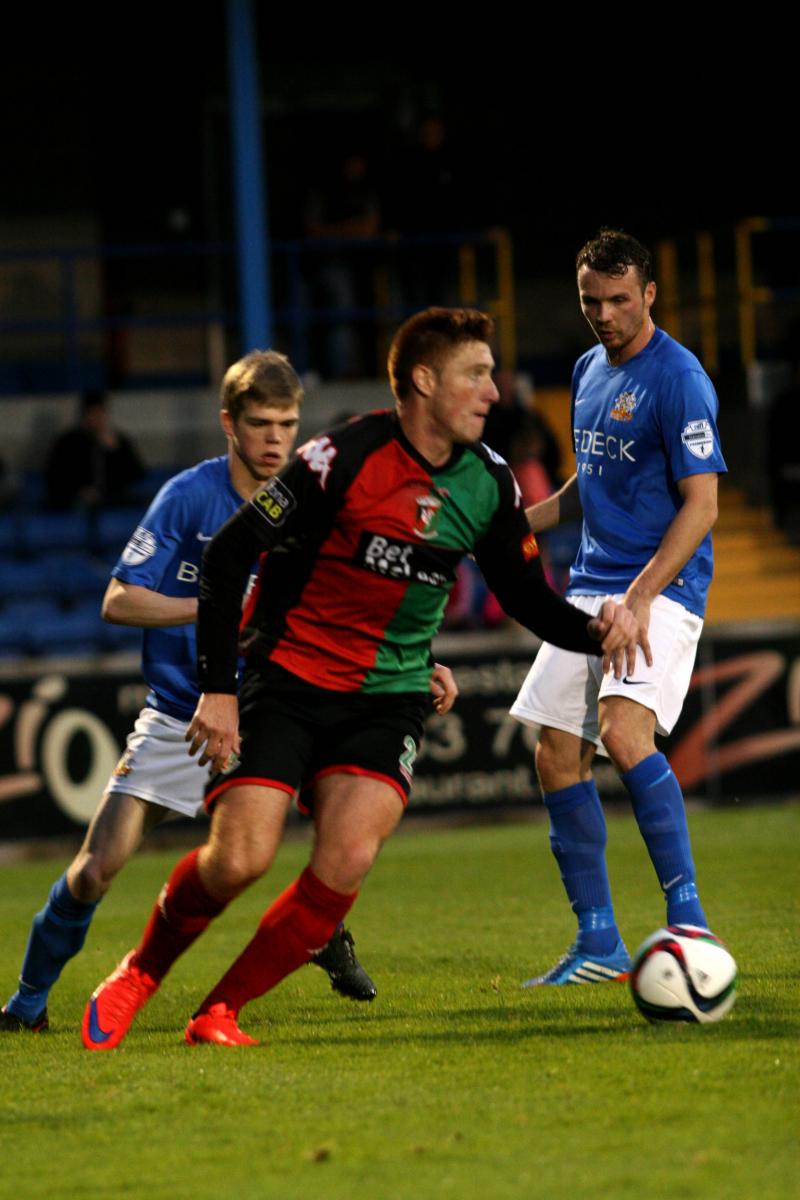 It was a much improved Glentoran after the breakand within 5 minutes of the restart both Conor McMenamin and Curtis Allen had gone close with curling shots from the edge of the penalty area. Glenavon then went on the offensive again with Barry Holland clearing the first effort, Aaron Hogg saving the second and finally Jonny Addis blocking a goal bound shot. On 53 minutes the Lurgan Blues should have broken the deadlock. David Scullion failed to keep possession and Glenavon broke down the right. Andy Hall's low cross found Joel Cooper in the 6-yard box but he somehow managed to scoop the ball over the crossbar with the goal at his mercy. The Glentoran defence continued to hold firm with all of the back four putting in excellent performances. Aaron Hogg made an excellent save on 63 minutes when Kevin Braniff's free kick form the left corner of the 18-yard box looked destined for the bottom corner of the net. On 70 minutes a free kick by David Scullion almost caught Tuffey out and the keeper just managed to turn the ball over the bar. Marcus Kane's header from the corner was then turned wide before Allen had another effort blocked. Moments later a high ball into the Glenavon penalty area saw Jonathan Tuffey and Kris Lindsay collide. Referee Hunter bizarrely gave the home side a free kick. the alleged culprit, Curtis Allen, was suitable baffled as were most of the spectators! Both sides continued to press for a winner with McMenamin unlucky at one end whilst Barry Holland was forced to clear the danger at the other. With just 4 minutes remaining the best chance of the game, from a Glentoran perspective, fell to Steven Gordon. He controlled the ball 16 yards from goal but fired straight at Tuffey.