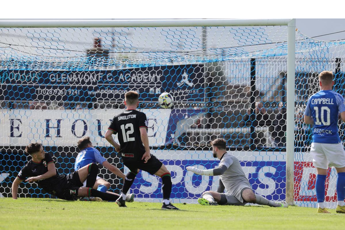 On the half hour the Glens suffered a blow when Rhys Marshall limped off as the result of a challenge a few minutes earlier. He was replaced by Paddy McClean on his first appearance since January. Any questions about the attitude of Glens fans to Paddy’s return was immediately answered by the rapturous reception he received from all parts of the away stand. McClean slotted in at left back with James Singleton moving to the right.