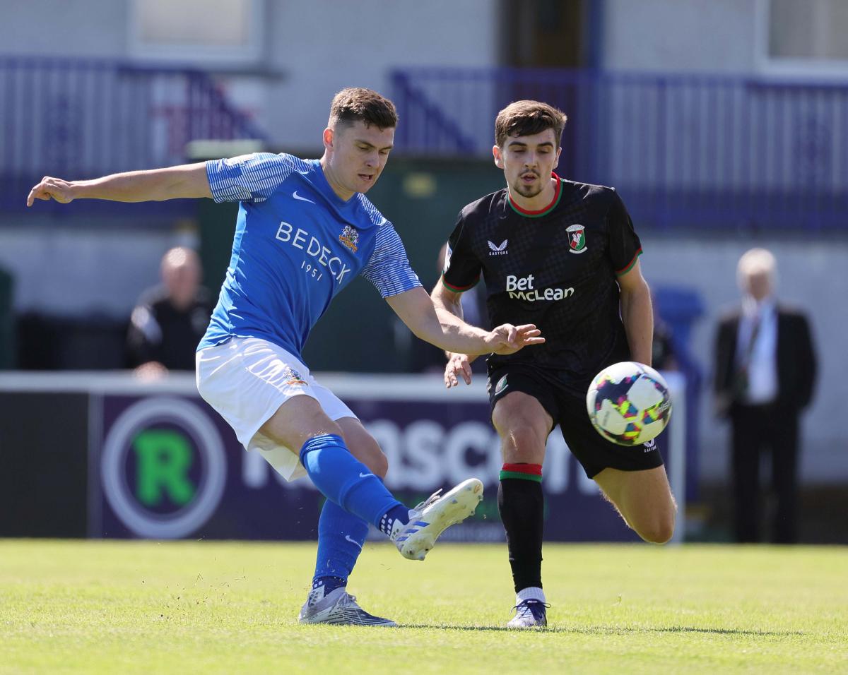 Glentoran got off to a strong start and nearly took the lead after four minutes. Rhys Marshall was sent clear by Palmer but his shot was well saved by Brown and the rebound cleared. Ten minutes later Daire O’Connor put in a great run and cross to Niall McGinn. McGinn’s shot was cleared off the line by a last gasp defender. McGinn had another good late run into the box shortly afterwards but was well tackled as he was poised to shoot.
