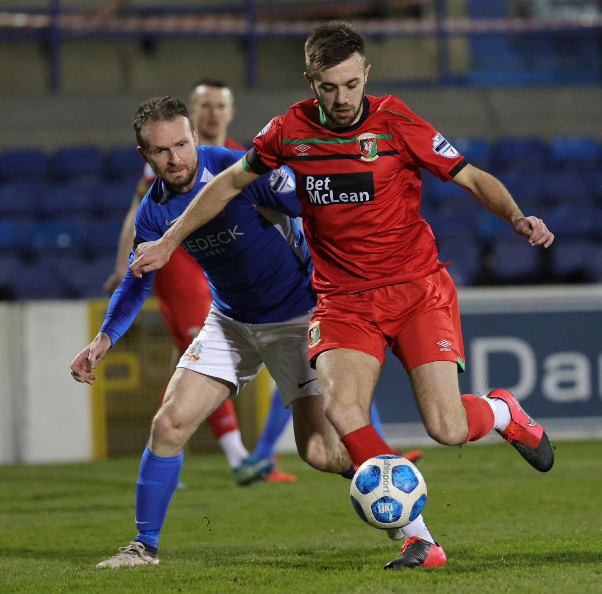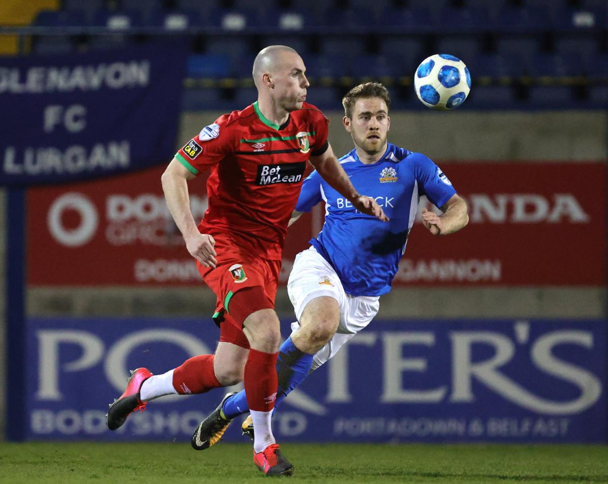 Glentoran went in front on 23 minutes. A trademark long diagonal pass from Luke McCullough came off the head of Glenavon defender Calvin Douglas but broke for Conor McMenamin. McMenamin drove down the left but as he cut inside he lost possession before winning the ball back again and cutting it back for Rory Donnelly who turned it home from 3 yards out. On 29 minutes Caolan Marron did well to control the ball on the right side of midfield before playing an excellent pass to Robbie McDaid. McDaid side-stepped Sean Ward before firing a shot on target but unfortunately for Robbie, it was straight at Craig Hyland in the home goal. McDaid seemed to pick up an injury and required treatment from the Glentoran physio. He was able to resume but only for a couple of minutes before being replaced by Ciaran O'Connor.