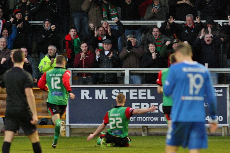 It was a much different Glentoran in the second period and 5 minutes after the restart they went in front. Jordan Stewart’s vicious 30 yard effort was too hot for Rouse and he scrambled the ball around the post for a corner. Stewart’s set piece was met by Birney and although his first effort was wide of the mark, when Stewart returned the ball back into the danger area Birney powered his header into the bottom corner. Five minutes later Birney did well to block a goal bound effort from Crawford but Ballinamallard United did equalise on 56 minutes. Cathal Beacom’s free kick from around 30 yards took a deflection off the Glentoran wall and Morris was unable to keep it out. Just after the hour substitute, Jimmy Callacher, was inches wide with a free kick but the Glentoran fans didn’t have to wait too long before they were celebrating another goal. And what a goal it was! Miskimmin created a chance for Scullion and he forced Rouse to concede yet another corner. The ball eventually broke to Jordan Stewart and his 30 yard exocet flew into the top left hand corner of the net. Goal of the Season? It’ll take something special to beat it!