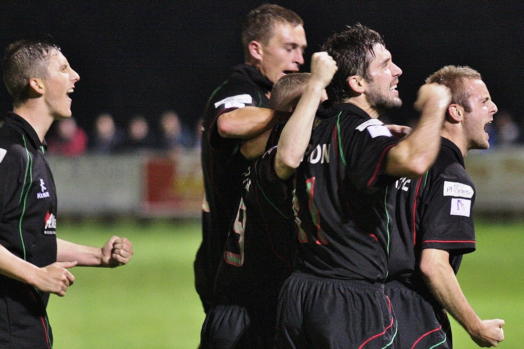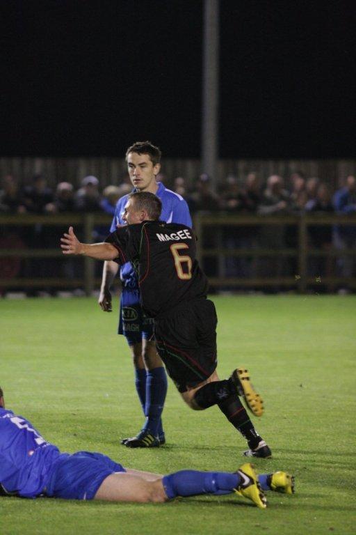On 16 minutes, against the run of play, Glentoran went in front. From a throw in on the right, Sean Ward found Jim O’Hanlon who slipped the ball through to Andy Waterworth. Waterworth steadied himself before firing the ball low into the bottom left corner of the goal, giving Rouse no chance. Ballinamallard United came straight back though. Andy Crawford picked up the ball, seemingly in an offside position, and broke forward. The referee’s assistant waved play on and as Crawford moved into the penalty area he went down under a challenge from Marcus Kane. Again the home side’s penalty appeals were ignored by the officials. Ballinamallard got a deserved equaliser on 24 minutes. The Glens conceded a free kick in midfield and the ball was hit long into the box. Morris started to come for it but changed his mind and was stranded when Mark Stafford got his head on it to make it 1-all. On the half hour mark there was another lucky escape for the Glens. A cross from the right was headed out by Jay Magee but it hit Calum Birney and rebounded onto the crossbar; Elliott Morris then turned it over for a corner. From the set piece Stafford should have given United the lead but his unchallenged header was off target. On 35 minutes a Ballinamallard free kick deflected off Sean Ward’s head and went narrowly over the bar. A minute later a poor clearance from Morris was picked up by a United player who fired it into the danger area. Leon Carters met it but his header went just wide. 3 minutes from the break Magee almost put the Glens in front when he got on the end of a corner from Stephen Carson but Alvin Rouse saved well.