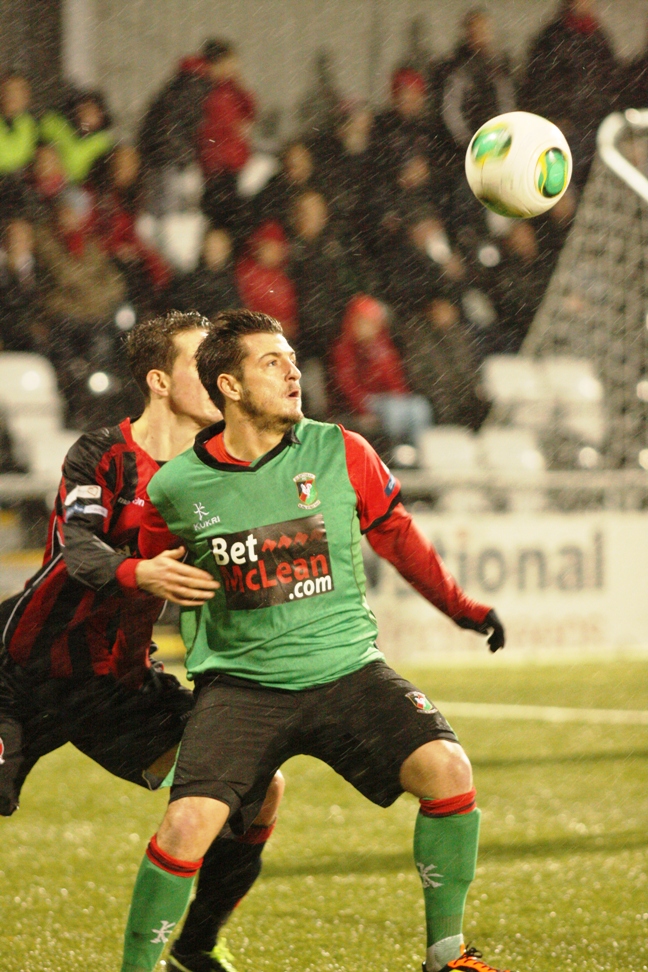 WIth conditions worsening in the second half, the ability for flowing football was becoming less and less and the game became a tough, physical contest. Controversy seemed to be following Heatley as he again escaped a red card when he broke clear of the Glentoran defence, miscontrolled past Morris and embarassingly dived to the ground. By letter of the law the referee should have punished Heatley with a second yellow but much to Glentoran supporters and players frustration he did not.