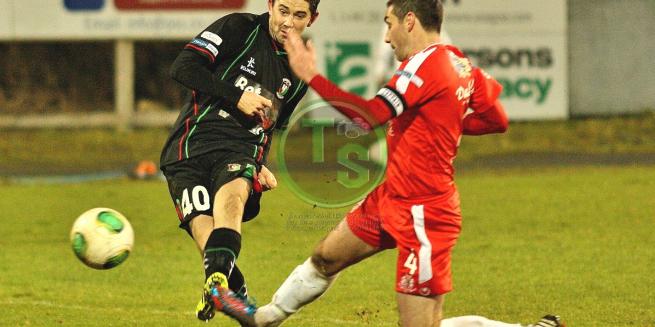 The game took a while to come to life as both teams battled hard on a tricky surface. After 18 minutes Nial Henderson almost broke the deadlock. Jordan Stewart's corner was only partially cleared and fell to Henderson on the edge of the area. The midfielder's sweetly struck shot looked goal bound but Miskelly in the home goal, tipped it over the crossbar. Stewart took the set piece which was cleared, again to Henderson. He returned it to Stewart and his dangerous cross was headed goalwards by debutant, Curtis Allen. Miskelly did well to keep it out but Aaron Boyd reacted quickest and smashed home his first Glentoran goal to put the visitors in front.