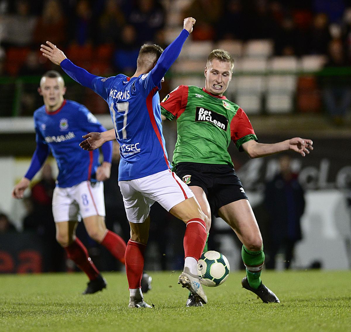 The first half was chequered with a number of heavy challenges, with referee Arnold Hunter handing out a number of yellow cards. Linfield had the best chances of the early play with an effort cleared off the line midway through the half.