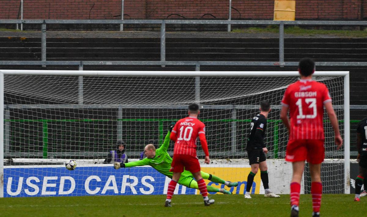 On 75 minutes Benji Magee broke down the left before picking out Ferris in the area but the big striker couldn't keep his shot on target. Ferris then outmuscled James Singleton and created a great opportunity for Magee to make it three. His goalbound effort was deflected onto the crossbar by Paddy McClean and McCarey was able to gather the rebound. In the final minute of added time a mix up between McClean and McCarey resulted in a penalty for Loughgall and it was perhaps fitting that Ferris, a thorn in Glentoran's side all afternoon, should dispatch it to make the final score Glentoran 0-3 Loughgall.