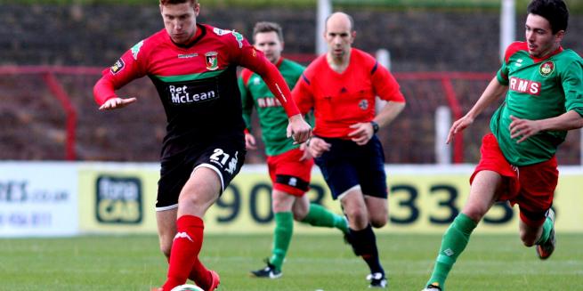 On 32 minutes a superb cross from the right from full back Barry Holland just eluded Steven Gordon attempted diving header. 3 minutes from the interval Glentoran spurned another opportunity to increase their lead when a curling cross from Kane was met by Scullion at the back post. Unfortunately his header went straight into the arms of Harrison. A minute late a sublime long ball from Kristian Gibson picked out Barry Holland on the right wing. Holland's first time cross into the danger area almost picked out Conor McMenamin.