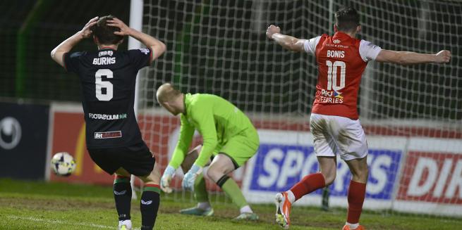 As the clock ticked down the visitors looked increasingly frustrated as a determined home defence kept them at bay with reasonable comfort. When the board went up to signal five minutes of stoppage time most home fans would have settled for the point as Larne desperately pressed for a winner. And it looked as if it we were going to ride our luck as Russell made an outstanding block as Bonis's volley looked destined for the back of the net. Then came the clearest example you are ever likely to see of how cruel our game can be as just seconds later the young defender stretched to cut out Bolger's ball into the box, only to divert the ball past a wrong footed McCarey and over the line. In the end the better team went home with the points but a tough one to take nevertheless.