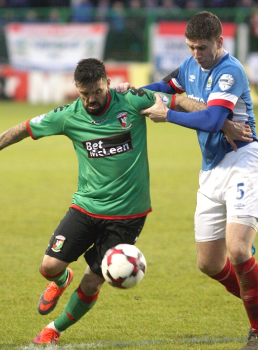 Extra time was delayed slightly whilst substitute Dwayne Nelson scaled the goalposts to fix a netting problem but unfortunately when it did get underway the visitors scored what would turn out be the winner. A long throw caused chaos in the Glentoran penalty area and Lowry cut the ball back for Waterworth who found the net. Glentoran immediately responded by bringing Stephen O’Flynn on but they could find the leveller, Chris Lavery smashed Glentoran’s best chance in extra time over the bar and Linfield always looked dangerous on the counter. Ross Gaynor had a drive saved by Morris and Jonny Addis kept the margin at 1 with a superb block when Lowry followed up on a great Morris save. The Glens threw men forward but the ball wouldn’t fall for them and it was the visitors who ultimately progressed. Full time Glentoran 1-2 Linfield.