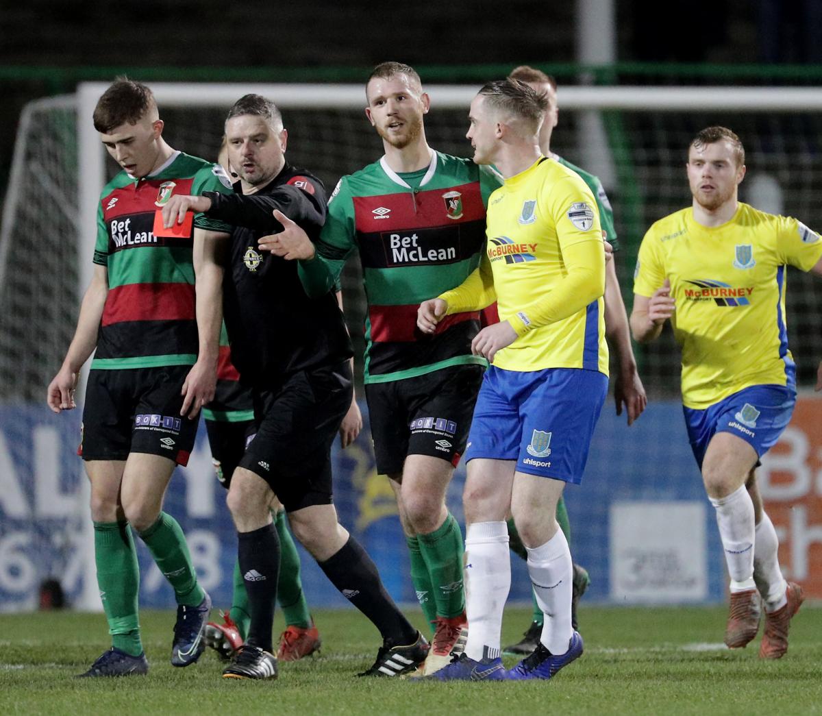 2 minutes later and Robbie had another chance but a last ditch tackle from Jim Ervin prevented McDaid doubling the Glentoran's lead. There was further drama on 90 minutes when a violent challenge by Adam Lecky on Chris Gallagher saw the Ballymena player rightly shown a red card. It the aftermath players from both sides got involved and there were further cards for O'Neill (red) and McClean (yellow). Bizarrely though referee Crangle stopped there with Cathair Friel particularly fortunate to escape any punishment. Deep into added time Friel hacked down Robbie McDaid right under the nose of the linesman but although Glentoran were awarded a free kick no further action was deemed necessary by the officials!