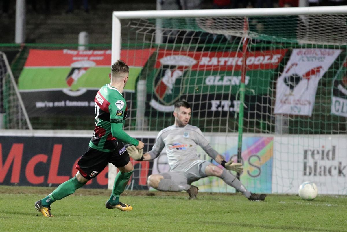 Birney was called on again 10 minutes after the break as Andrew McGrory looked to create a chance at the City End but the double centurion kept him out. Just before the hour mark manager, Mick McDermott made a double substitution as the Glens looked to up the pace and try to get all 3 points. Both showed attacking intent and Navid Nasseri's cross created an opportunity for Paul O'Neill (64) but the young striker was off target. Cameron Stewart (68) then headed over when set up by Robbie McDaid. McDaid himself then missed a great opportunity to break the deadlock on 70 minutes. A corner to the back post was hooked back across goal by Marcus Kane, the ball finding McDaid but the striker with 12 goals already this season couldn't test the rookie Ballymena United keeper.