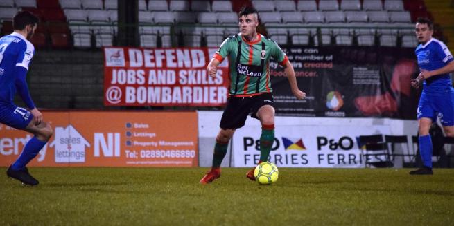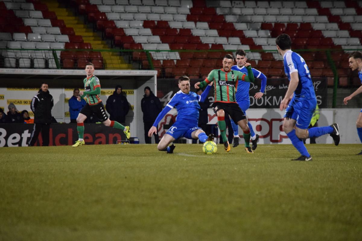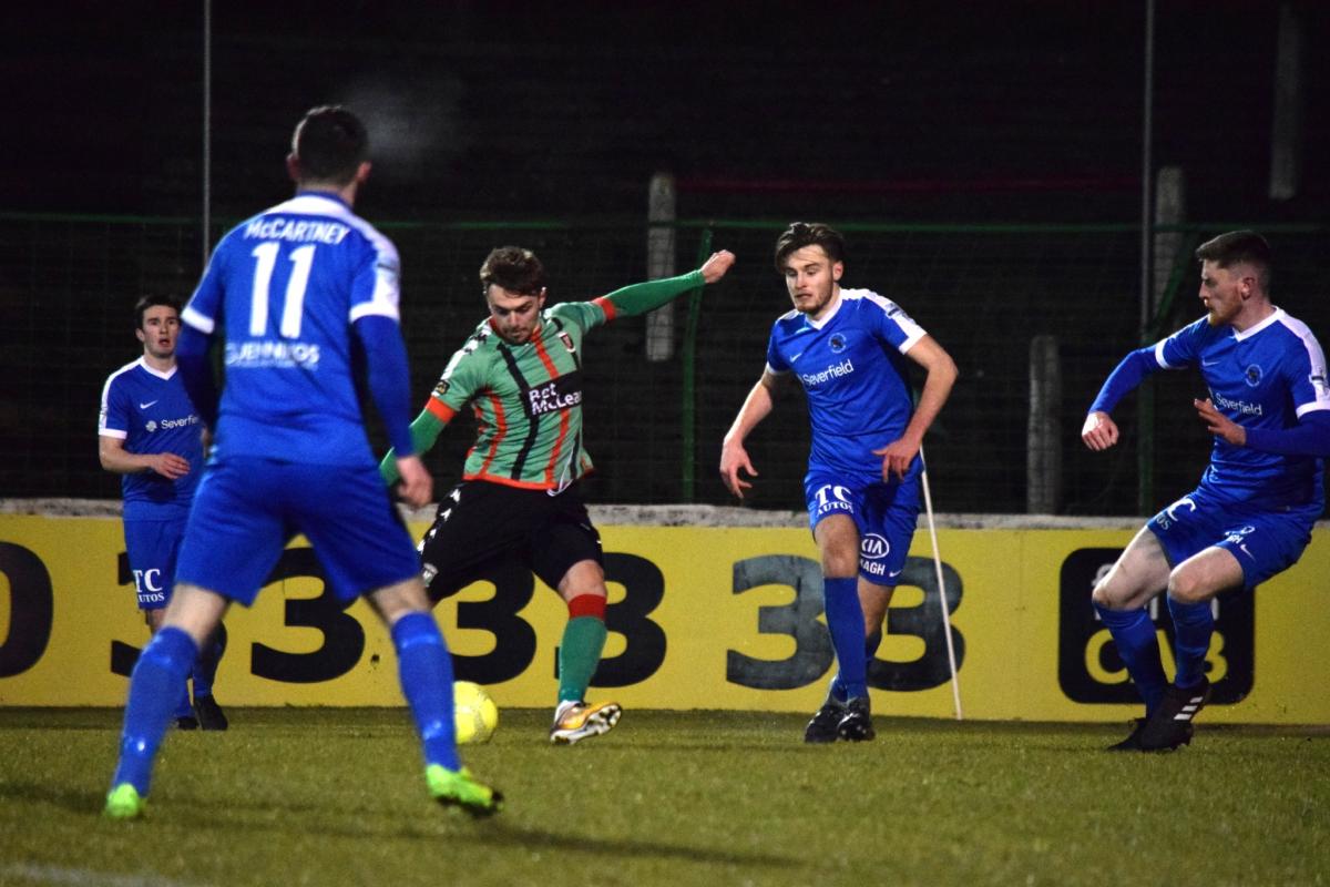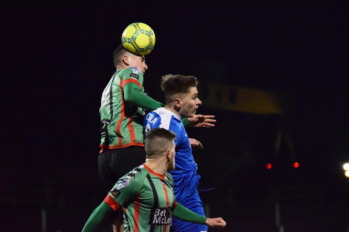 Two second half goals were enough to give Glentoran three points in a scrappy encounter with Ballinamallard United on a bitterly cold night at The Oval. Goals from Willie Garrett and Curtis Allen were enough to overcome Sean Noble’s first half opener. Glentoran made one change to the side that won 4-0 at Ballyclare Comrades on Saturday with James Knowles coming in for the suspended Dylan Davidson. On a frosty night the game started slowly with both teams looking cautious early on. Five minutes in Glentoran thought they had the lead as a long ball saw Curtis Allen outmuscle the last defender and lob the ball neatly over Richard Brush into the net, only to see Ian McNabb deem his contact with the defender to have been a foul. The visitors were next to threaten when a defensive lapse from Birney let Joshua McIlwaine in but he dragged his shot harmlessly wide of Morris’ post. Willie Garrett and Peter McMahon then went close for Glentoran, Garrett volleying over after a short corner and McMahon heading wide from a neat Curtis Allen cross as both teams found it difficult to create chances in the opening half