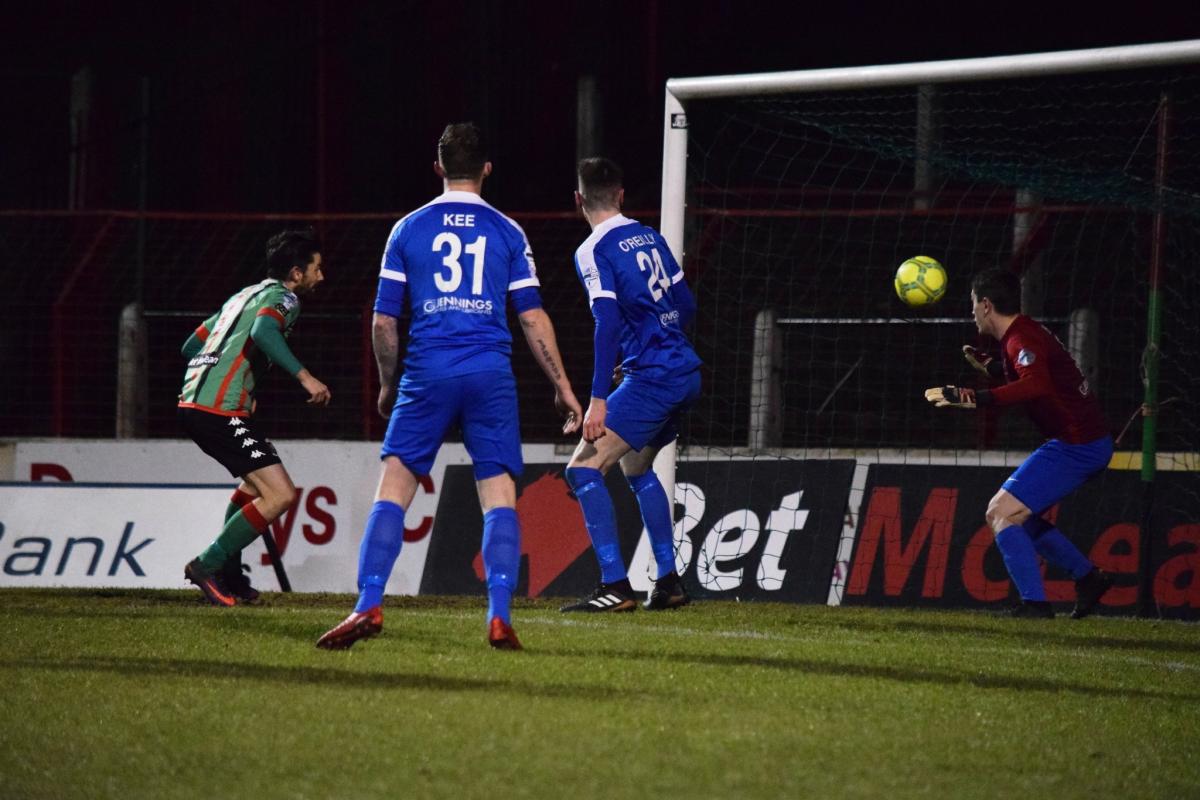 Early in the second half it was clear Glentoran were intent on testing McKenna’s goalkeeping ability but McMahon, Knowles and Kane (twice) were all off target from outside the penalty area within the opening fifteen minutes of the half. During this spell Ryan Curran almost doubled the visitors lead with a looping header that struck the crossbar. It was beginning to look like the home side would be frustrated, stand-in McKenna did well to deny Allen one on one and dealt well with a trio of Glentoran corners which were whipped in under his crossbar but with 25 minutes remaining the breakthrough came. A James Knowles free kick was deflected behind and from the resulting corner Willie Garret saw his header deflect in off a Ballinamallard defender. The visitors regrouped and were obviously content with a hard earned draw, but they were to be denied 15 minutes from time as Peter McMahon worked the ball out from under his feet in a crowded penalty area and shot through a crowd, the strike appeared to be going wide but Curtis Allen was there to finish smartly into the roof of the visitors net to win the game. The defenders were left looking for a flag that never came, one man near the corner flag appearing to play Allen onside.