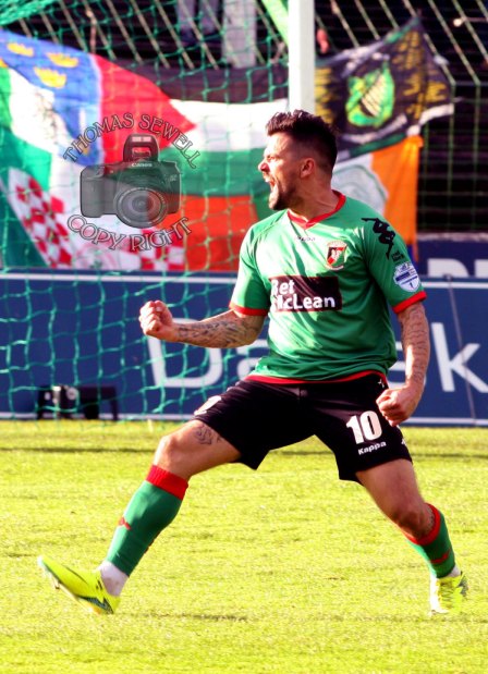 Two minutes after the start of the half, a forward header by Harmon fell to Novo who turned and volleyed the ball high into the net. A great goal to mark his first goal of the league, with not only the fans but the player delighted. In the next 15 minutes, the Glens took the game to Cliftonville, giving them no time to dwell on the ball and forcing them into misplaced passes. Novo continued to be inspired and demonstrated some of his undoubted football ability when he was indeed unlucky not to score another two goals.