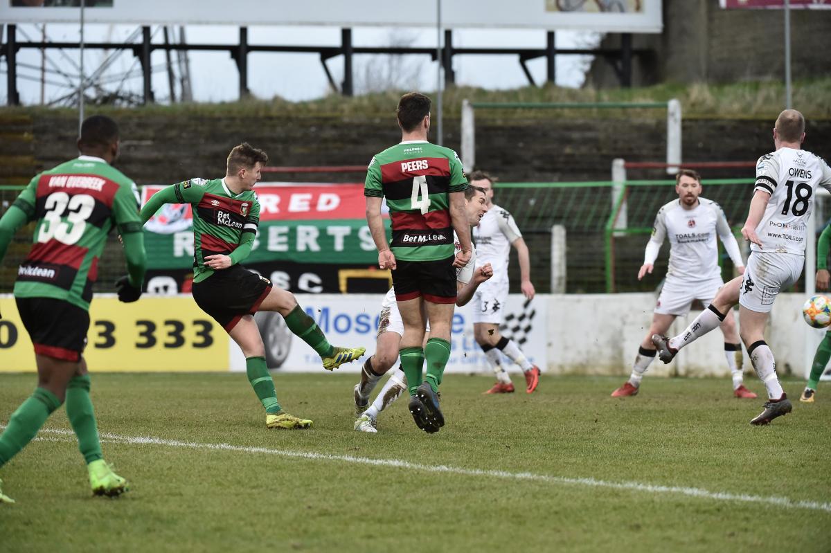 Mick McDermott made four changes to last week’s starting line up with the suspended Seanen Clucas was replaced by Joe Crowe, Elliott Morris back in for Marijan Antolovic and Willie Garrett and Paul O’Neill replacing Conor Pepper and Elvio Van Overbeek respectively. The three strikers picked up front – McDaid and O’Neill either side of Ruaidhri Donnelly – demonstrated the manager’s intention to attack Crusaders in the very difficult conditions.