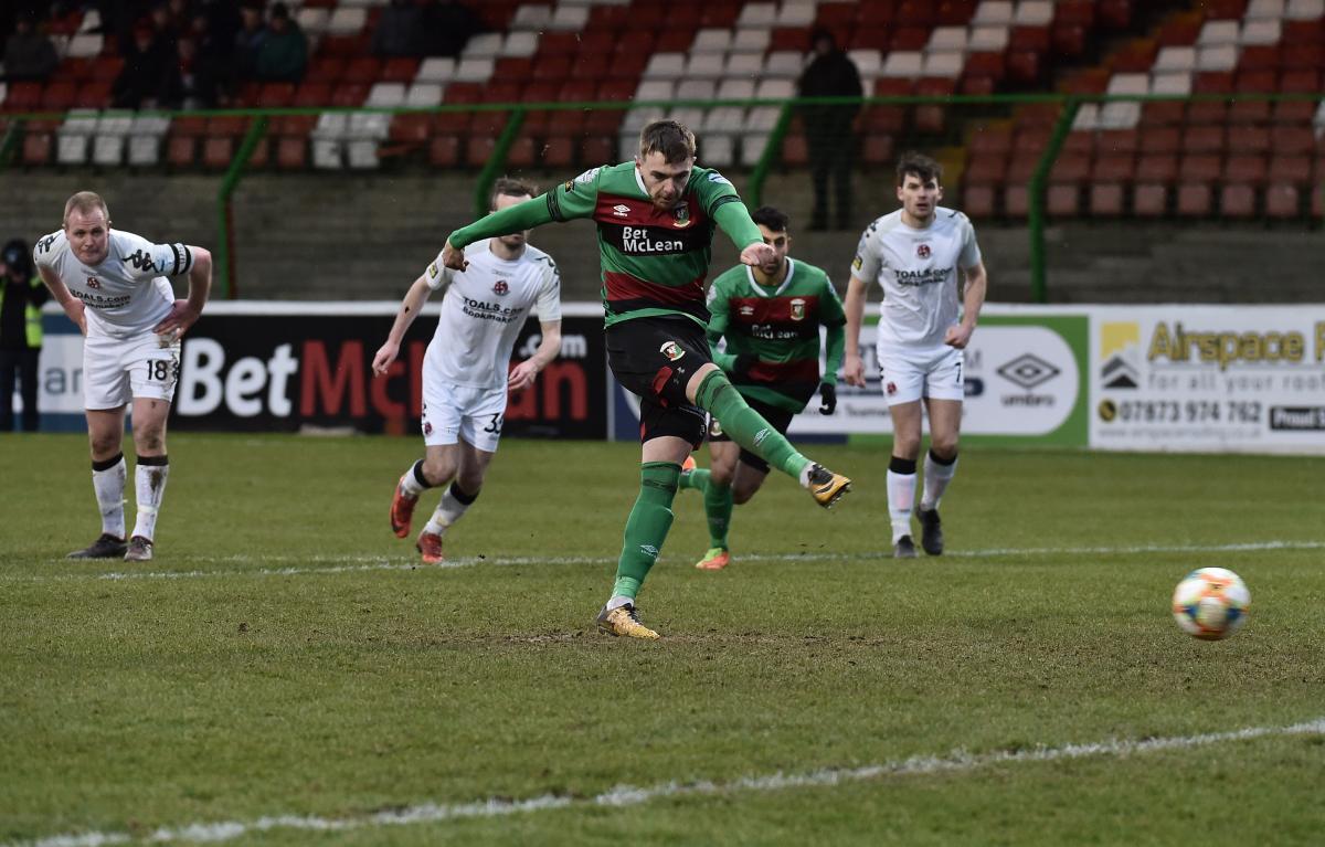 Elvio Van Overbeek passed to Robbie McDaid inside the Crusaders box. McDaid did very well to get to the by-line and get a cross in, but it was clearly hit out of play by the outstretched hand of Crusaders’ left back, Jarlath O’Rourke. The linesman didn’t flag for a penalty so referee Andrew Davey – who had kept the game flowing and under control – turned down the Glens players penalty claims and awarded a corner. He them consulted his fourth official, Raymond Crangle who informed him that it was indeed a handball. Penalty given! Mick McDermott said after the game that since it was a cup week, he’d had a group of players working on penalties, so it was to be given to whoever felt most confident. To his credit our tops scorer McDaid, who’d had a difficult day in front of goal, had the bottle to step up to drive it to Doherty’s right to give the Glens the lead for the first time. 2-1 Glens!