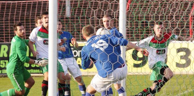 However the home side responded almost straight away, Carson’s cross from the left headed down by Richard Clarke to David Howland whose shot was deflected for a corner. Carson took the resulting kick and found Mark Clarke unmarked at the far post who headed goalwards. The ball was cleared by a defender standing on the line but referee Davy Malcolm and his assistant ruled that the ball had already crossed the line and there were few complaints from the Glenavon players. The Glens saw out the rest of the game in reasonable comfort but there was a late scare when a superb Gary Hamilton cross from the left looked likely to end up in the back of the net before Hogg did brilliantly to fingertip it off the head of a Glenavon forward at full stretch.