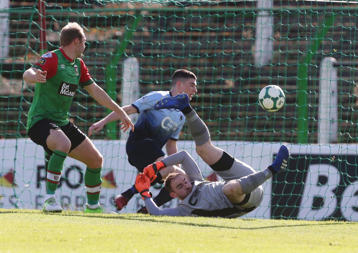 Just after the half hour mark Elliott Morris did really well to turn a 25-yard drive from Jamie McIntyre around the post for a corner. Again Glentoran defended the set piece well but a minute later Institute were awarded another pretty soft free kick. It was taken quickly and McIntyre's cross from the right was turned home by Michael McCrudden. Elliott Morris actually did well to get a hand on the ball but couldn't prevent the goal. 5 minutes from the break another Glentoran attack was broken up by what appeared to be a clear hand ball from a 'Stute defender. The erratic Marshall gave nothing! The home side had two further chances to go into the interval in front. Firstly a 25 yard drive from right back, Nathan Kerr flashed wide of the post and then Redman combined with Allen but the Glentoran number 9 saw his lobbed effort hit the crossbar.