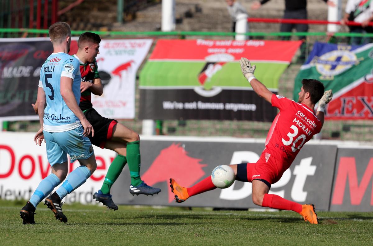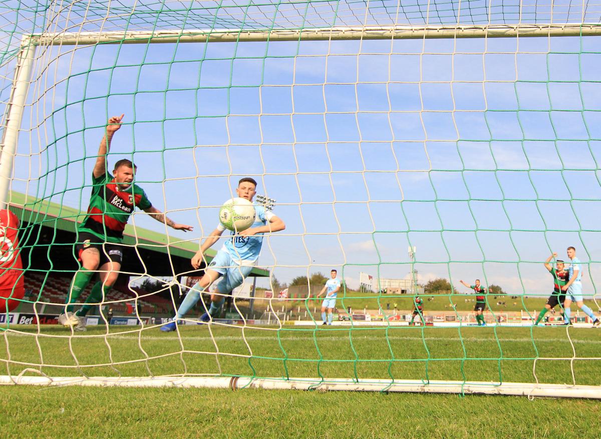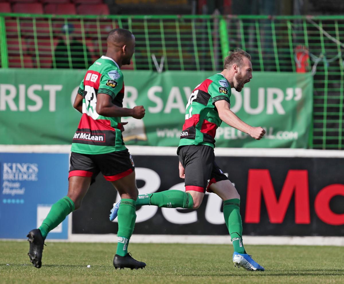 On eight minutes it might have been 2-nil, Plum finding Elvio Van Overbeek in the area but the Dutchman's shot across goal was inches wide of the far post. Van Overbeek went close again a couple of minutes later, forcing a good save out of the Warrenpoint keeper. Glentoran were in total control but the second goal was proving elusive. Midway through the half both McDaid and O'Neill had efforts that were just off target. On 29 minutes a superb break by Robbie McDaid saw the striker outpace the defence and put a perfect ball into the middle for Paul O'Neill but his shot was blocked by the keeper when he really should have scored.
