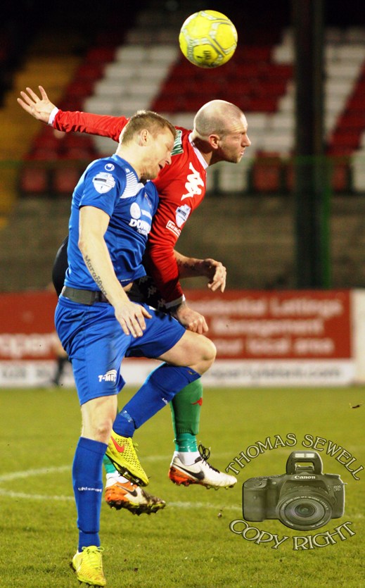 The game started in very blustery conditions, Glentoran playing the first half with the wind at their backs. Indeed it seemed to take both teams some time to adjust to the conditions as neither side carved out an opening in the first ten minutes. Dungannon bossed possession early on and were first to threaten, much coveted frontman Andy Mitchell showed good strength to hold off Magee and then find Jamie Glackin cutting in from the right. Glackin’s driven effort saw Morris parry the shot and then react first to dive safely on the loose ball with Mitchell racing in. Glentoran then showed some attacking intent as first Allen flashed a volley wide and then Jonny Addis almost flicked a low Lavery corner beyond Coleman in the Swifts goal.