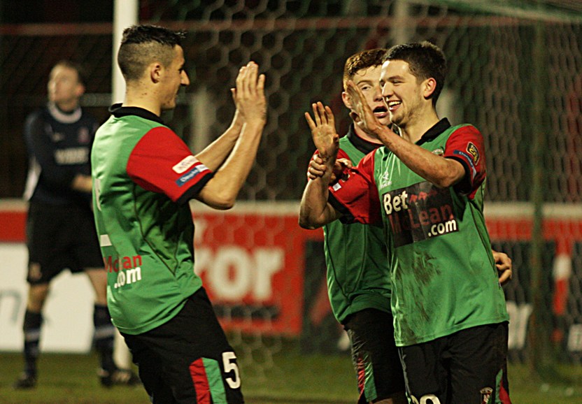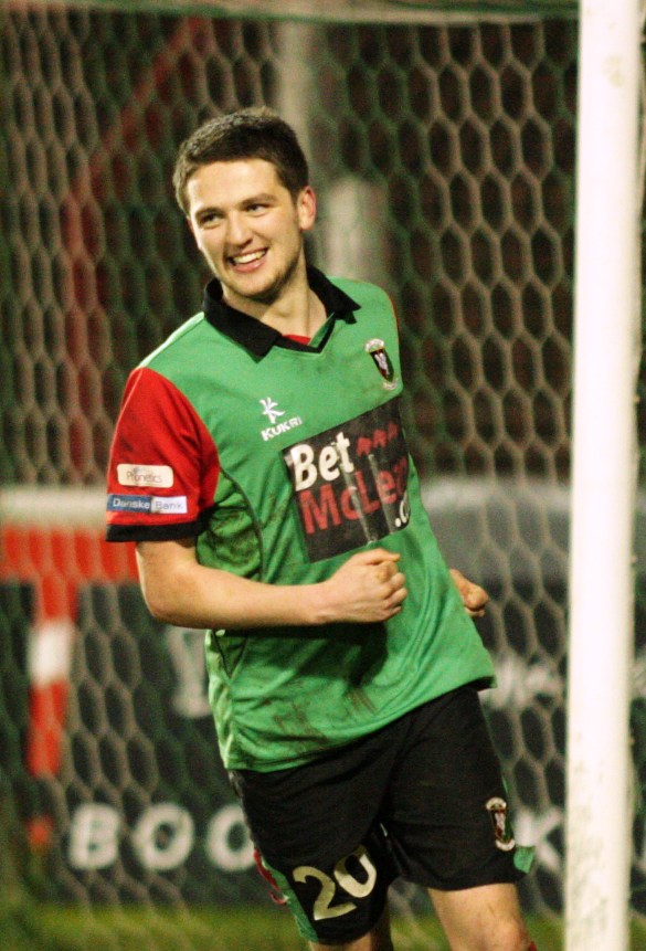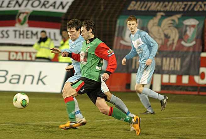 United had a chance to get back into the game just 3 minutes into the second half. Skipper Allan Jenkins broke clear but Willie Garrett's challenge denied him a shooting opportunity. On 50 minutes it was 2-0 to Glentoran. The excellent McKee broke down the left, beat the right full-back and fired the ball across goal. Scullion stepped over the ball, leaving it for Fra McCaffrey who controlled it before firing into the bottom corner past a helpless Shanahan. On the hour mark Shanahan almost cost his team a third; his poor kick out going straight to McCaffrey. McCaffrey found O'Hanlon well placed but his shot sailed over the bar. 2 minutes later Shanahan did well to tip McCaffrey's shot over the crossbar after a good move involving him and David Scullion. Scullion was the victim of a crude challenge from former Glentoran defender, Johnny Taylor. The big centre back, who had already been yellow carded, was perhaps fortunate not to pick up a second. On 73 minutes Glentoran won a throw in close to the left hand corner flag. O'Hanlon received the ball in the box and his trickery was too much for Taylor who bundled him over, conceding a spot kick. With Jay Magee missing through injury, Jim O'Hanlon took responsibility himself and duly dispatched the ball into the back of the net.