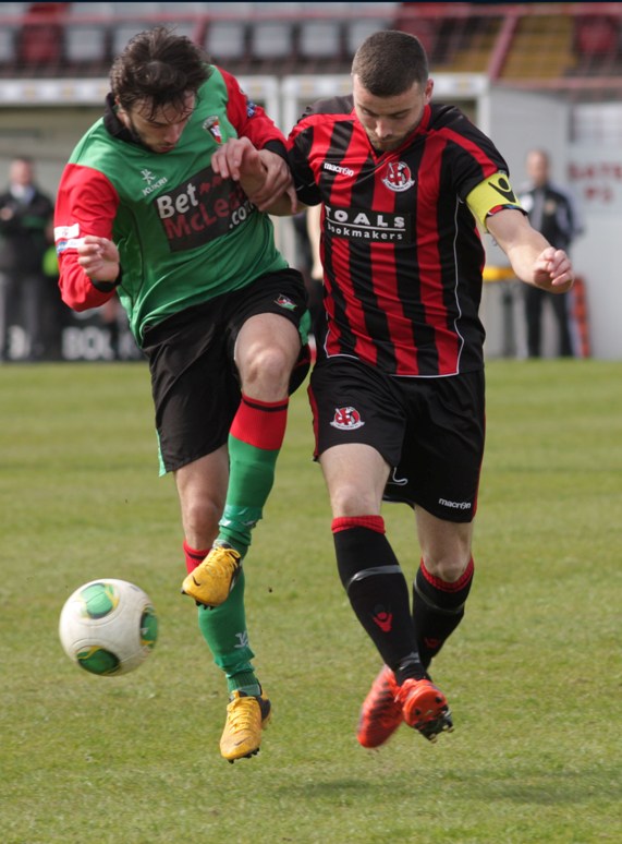 The visitors had the first opportunity of the game on 6 minutes with Jordan Owens rising to meet a cross from the right but Elliott Morris made the save. A minute later and Glentoran went in front. John McGuigan was brought down 25 yards from goal and Curtis Allen stepped up to curl a delightful free-kick beyond the reach of Sean O'Neill. McGuigan was in the thick of the action again on 10 minutes, winning the ball in midfield before finding David Scullion on the left. His cross was met by Aaron Boyd but he was unable to direct his header on target. Just before the quarter hour mark the Glens had a good shout for a penalty when John McGuigan's corner striking the arm of David Magowan in the area. Referee McNab, who had blown up for a similar offence in midfield moments earlier, dismissed the Glentoran players' appeals. On 20 minutes David Scullion was bundled over in the box but again McNab ruled, no penalty. The referee further frustrated the home support on 23 minutes. A long ball forward left Allen and Boyd with just one defender to beat but the official pulled the game back to award the Glens a free kick on the halfway line! Former Glentoran midfielder, Richard Clarke, tried his luck from 30 yards but Elliott Morris dealt with it comfortably. With 36 minutes gone Glentoran were awarded another free kick some 30 yards from goal. Willie Garrett took it, firing the ball into the danger area where John M<cGuigan deflected it narrowly wide. Elliott Morris conceded a penalty kick on 38 minutes. Nathan Hanley took it but Morris, diving to his left, made the save. Hanley headed the ball goalwards but David Scullion hooked it off the goal line. Scullion then missed a great opportunity to double the home side's lead but he failed to connect properly with Aaron Boyd's pass.