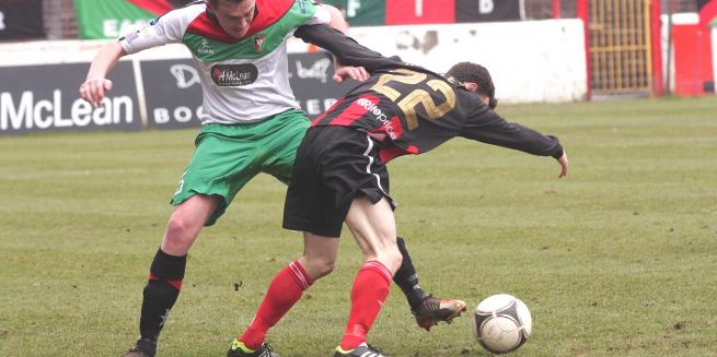 At this stage there looked like being only one winner with the home side enjoying the bulk of the possession as well as playing some neat and attractive football. However with eighteen minutes left they were hit with a sucker punch. Coates’s long clearance from his own half fell kindly for Heatley who ran clear of the defence and superbly lobbed the advancing Morris from the edge of the box to put his side back into the lead. Not surprisingly this was a savage blow to the Glens and the rejuvenated Crues started to create chances once again, adding to their tally on eighty one minutes. After a corner was only half cleared the ball fell to substitute David McMaster who evaded an O’Hanlon challenge before cutting in from the right and curling a brilliant effort into the top corner. This left no realistic way back for the Glens but with the last kick of the game substitute Stephen Carson went on a trademark run down the left and curled a ball to the far post which evaded Lacroix and nestled in the back of the net.