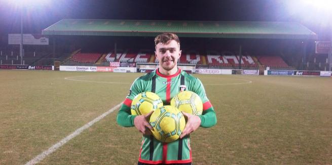 On 69 minutes it was 4-nil Excellent link up play between the two Glentoran forwards saw Allen put McDaid clear. As Parr rushed out of his goal McDaid calmly lobbed the ball over him and into the Sydenham end goal. With 4 minutes remaining Robbie McDaid completed his first senior hattrick. Substitute Dylan Davidson found McDaid just inside the Warrenpoint Town half. McDaid drove forward and as he reached the edge of the area struck the ball past Jonny Parr and into the bottom corner of the net.